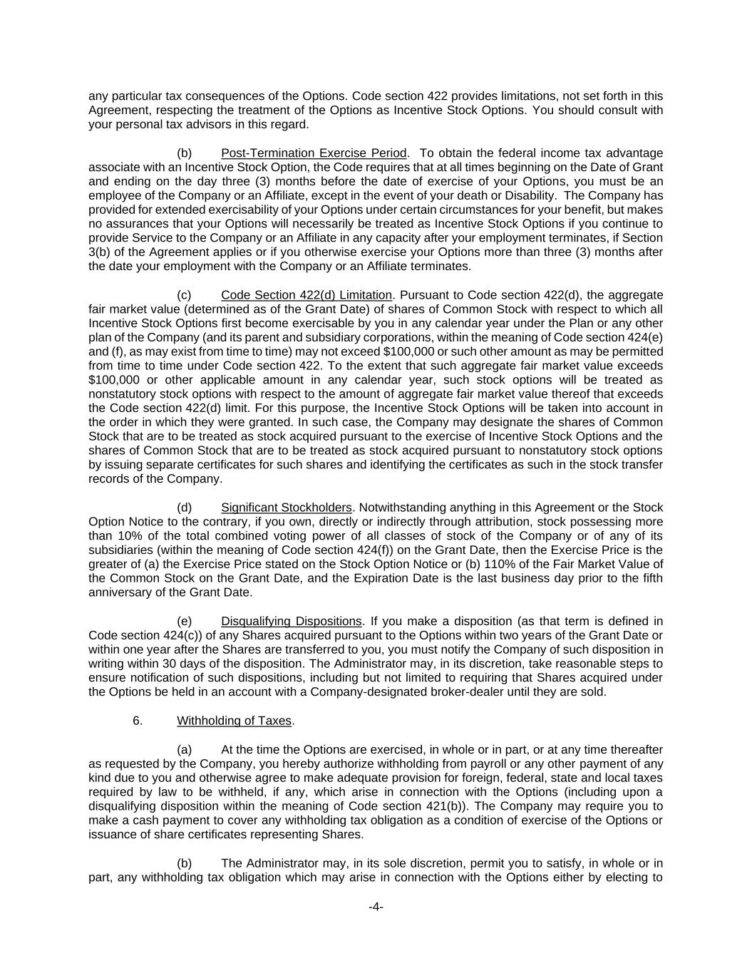 -4- any particular tax consequences of the Options. Code section 422 provides limitations, not set forth in this Agreement, respecting the treatment of the Options as Incentive Stock Options. You should consult with your personal tax advisors in this regard. (b) Post-Termination Exercise Period. To obtain the federal income tax advantage associate with an Incentive Stock Option, the Code requires that at all times beginning on the Date of Grant and ending on the day three (3) months before the date of exercise of your Options, you must be an employee of the Company or an Affiliate, except in the event of your death or Disability. The Company has provided for extended exercisability of your Options under certain circumstances for your benefit, but makes no assurances that your Options will necessarily be treated as Incentive Stock Options if you continue to provide Service to the Company or an Affiliate in any capacity after your employment terminates, if Section 3(b) of the Agreement applies or if you otherwise exercise your Options more than three (3) months after the date your employment with the Company or an Affiliate terminates. (c) Code Section 422(d) Limitation. Pursuant to Code section 422(d), the aggregate fair market value (determined as of the Grant Date) of shares of Common Stock with respect to which all Incentive Stock Options first become exercisable by you in any calendar year under the Plan or any other plan of the Company (and its parent and subsidiary corporations, within the meaning of Code section 424(e) and (f), as may exist from time to time) may not exceed $100,000 or such other amount as may be permitted from time to time under Code section 422. To the extent that such aggregate fair market value exceeds $100,000 or other applicable amount in any calendar year, such stock options will be treated as nonstatutory stock options with respect to the amount of aggregate fair market value thereof that exceeds the Code section 422(d) limit. For this purpose, the Incentive Stock Options will be taken into account in the order in which they were granted. In such case, the Company may designate the shares of Common Stock that are to be treated as stock acquired pursuant to the exercise of Incentive Stock Options and the shares of Common Stock that are to be treated as stock acquired pursuant to nonstatutory stock options by issuing separate certificates for such shares and identifying the certificates as such in the stock transfer records of the Company. (d) Significant Stockholders. Notwithstanding anything in this Agreement or the Stock Option Notice to the contrary, if you own, directly or indirectly through attribution, stock possessing more than 10% of the total combined voting power of all classes of stock of the Company or of any of its subsidiaries (within the meaning of Code section 424(f)) on the Grant Date, then the Exercise Price is the greater of (a) the Exercise Price stated on the Stock Option Notice or (b) 110% of the Fair Market Value of the Common Stock on the Grant Date, and the Expiration Date is the last business day prior to the fifth anniversary of the Grant Date. (e) Disqualifying Dispositions. If you make a disposition (as that term is defined in Code section 424(c)) of any Shares acquired pursuant to the Options within two years of the Grant Date or within one year after the Shares are transferred to you, you must notify the Company of such disposition in writing within 30 days of the disposition. The Administrator may, in its discretion, take reasonable steps to ensure notification of such dispositions, including but not limited to requiring that Shares acquired under the Options be held in an account with a Company-designated broker-dealer until they are sold. 6. Withholding of Taxes. (a) At the time the Options are exercised, in whole or in part, or at any time thereafter as requested by the Company, you hereby authorize withholding from payroll or any other payment of any kind due to you and otherwise agree to make adequate provision for foreign, federal, state and local taxes required by law to be withheld, if any, which arise in connection with the Options (including upon a disqualifying disposition within the meaning of Code section 421(b)). The Company may require you to make a cash payment to cover any withholding tax obligation as a condition of exercise of the Options or issuance of share certificates representing Shares. (b) The Administrator may, in its sole discretion, permit you to satisfy, in whole or in part, any withholding tax obligation which may arise in connection with the Options either by electing to