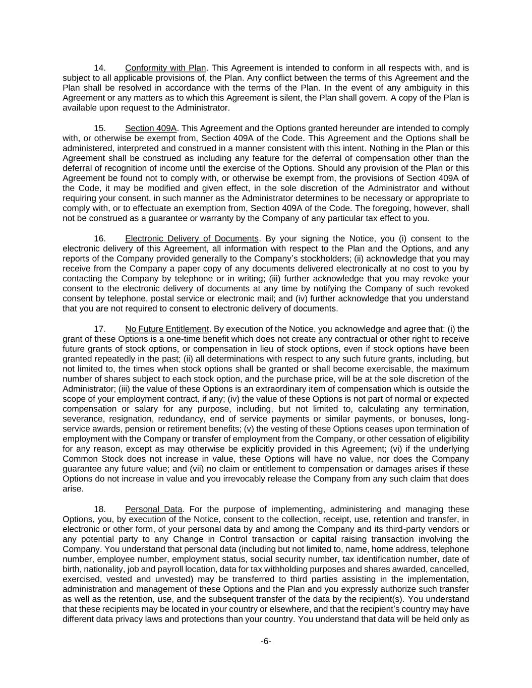 -6- 14. Conformity with Plan. This Agreement is intended to conform in all respects with, and is subject to all applicable provisions of, the Plan. Any conflict between the terms of this Agreement and the Plan shall be resolved in accordance with the terms of the Plan. In the event of any ambiguity in this Agreement or any matters as to which this Agreement is silent, the Plan shall govern. A copy of the Plan is available upon request to the Administrator. 15. Section 409A. This Agreement and the Options granted hereunder are intended to comply with, or otherwise be exempt from, Section 409A of the Code. This Agreement and the Options shall be administered, interpreted and construed in a manner consistent with this intent. Nothing in the Plan or this Agreement shall be construed as including any feature for the deferral of compensation other than the deferral of recognition of income until the exercise of the Options. Should any provision of the Plan or this Agreement be found not to comply with, or otherwise be exempt from, the provisions of Section 409A of the Code, it may be modified and given effect, in the sole discretion of the Administrator and without requiring your consent, in such manner as the Administrator determines to be necessary or appropriate to comply with, or to effectuate an exemption from, Section 409A of the Code. The foregoing, however, shall not be construed as a guarantee or warranty by the Company of any particular tax effect to you. 16. Electronic Delivery of Documents. By your signing the Notice, you (i) consent to the electronic delivery of this Agreement, all information with respect to the Plan and the Options, and any reports of the Company provided generally to the Company’s stockholders; (ii) acknowledge that you may receive from the Company a paper copy of any documents delivered electronically at no cost to you by contacting the Company by telephone or in writing; (iii) further acknowledge that you may revoke your consent to the electronic delivery of documents at any time by notifying the Company of such revoked consent by telephone, postal service or electronic mail; and (iv) further acknowledge that you understand that you are not required to consent to electronic delivery of documents. 17. No Future Entitlement. By execution of the Notice, you acknowledge and agree that: (i) the grant of these Options is a one-time benefit which does not create any contractual or other right to receive future grants of stock options, or compensation in lieu of stock options, even if stock options have been granted repeatedly in the past; (ii) all determinations with respect to any such future grants, including, but not limited to, the times when stock options shall be granted or shall become exercisable, the maximum number of shares subject to each stock option, and the purchase price, will be at the sole discretion of the Administrator; (iii) the value of these Options is an extraordinary item of compensation which is outside the scope of your employment contract, if any; (iv) the value of these Options is not part of normal or expected compensation or salary for any purpose, including, but not limited to, calculating any termination, severance, resignation, redundancy, end of service payments or similar payments, or bonuses, long- service awards, pension or retirement benefits; (v) the vesting of these Options ceases upon termination of employment with the Company or transfer of employment from the Company, or other cessation of eligibility for any reason, except as may otherwise be explicitly provided in this Agreement; (vi) if the underlying Common Stock does not increase in value, these Options will have no value, nor does the Company guarantee any future value; and (vii) no claim or entitlement to compensation or damages arises if these Options do not increase in value and you irrevocably release the Company from any such claim that does arise. 18. Personal Data. For the purpose of implementing, administering and managing these Options, you, by execution of the Notice, consent to the collection, receipt, use, retention and transfer, in electronic or other form, of your personal data by and among the Company and its third-party vendors or any potential party to any Change in Control transaction or capital raising transaction involving the Company. You understand that personal data (including but not limited to, name, home address, telephone number, employee number, employment status, social security number, tax identification number, date of birth, nationality, job and payroll location, data for tax withholding purposes and shares awarded, cancelled, exercised, vested and unvested) may be transferred to third parties assisting in the implementation, administration and management of these Options and the Plan and you expressly authorize such transfer as well as the retention, use, and the subsequent transfer of the data by the recipient(s). You understand that these recipients may be located in your country or elsewhere, and that the recipient’s country may have different data privacy laws and protections than your country. You understand that data will be held only as