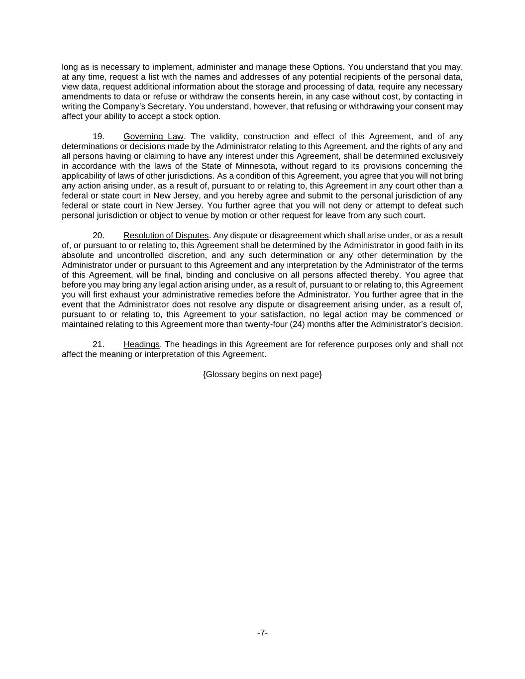 -7- long as is necessary to implement, administer and manage these Options. You understand that you may, at any time, request a list with the names and addresses of any potential recipients of the personal data, view data, request additional information about the storage and processing of data, require any necessary amendments to data or refuse or withdraw the consents herein, in any case without cost, by contacting in writing the Company’s Secretary. You understand, however, that refusing or withdrawing your consent may affect your ability to accept a stock option. 19. Governing Law. The validity, construction and effect of this Agreement, and of any determinations or decisions made by the Administrator relating to this Agreement, and the rights of any and all persons having or claiming to have any interest under this Agreement, shall be determined exclusively in accordance with the laws of the State of Minnesota, without regard to its provisions concerning the applicability of laws of other jurisdictions. As a condition of this Agreement, you agree that you will not bring any action arising under, as a result of, pursuant to or relating to, this Agreement in any court other than a federal or state court in New Jersey, and you hereby agree and submit to the personal jurisdiction of any federal or state court in New Jersey. You further agree that you will not deny or attempt to defeat such personal jurisdiction or object to venue by motion or other request for leave from any such court. 20. Resolution of Disputes. Any dispute or disagreement which shall arise under, or as a result of, or pursuant to or relating to, this Agreement shall be determined by the Administrator in good faith in its absolute and uncontrolled discretion, and any such determination or any other determination by the Administrator under or pursuant to this Agreement and any interpretation by the Administrator of the terms of this Agreement, will be final, binding and conclusive on all persons affected thereby. You agree that before you may bring any legal action arising under, as a result of, pursuant to or relating to, this Agreement you will first exhaust your administrative remedies before the Administrator. You further agree that in the event that the Administrator does not resolve any dispute or disagreement arising under, as a result of, pursuant to or relating to, this Agreement to your satisfaction, no legal action may be commenced or maintained relating to this Agreement more than twenty-four (24) months after the Administrator’s decision. 21. Headings. The headings in this Agreement are for reference purposes only and shall not affect the meaning or interpretation of this Agreement. {Glossary begins on next page}