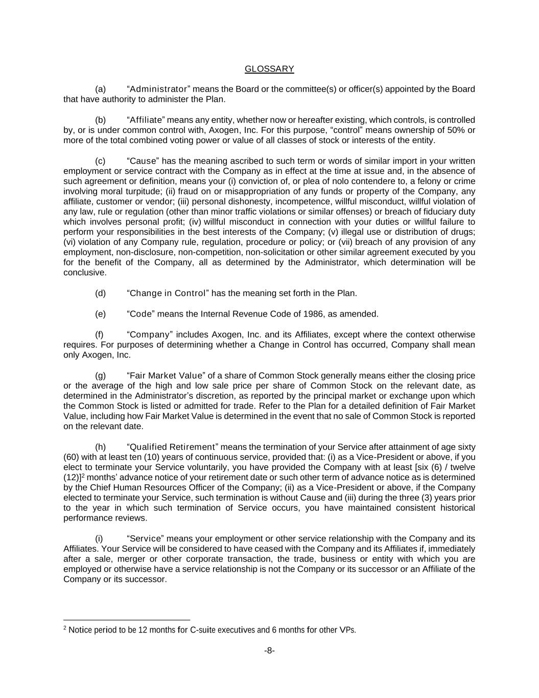-8- GLOSSARY (a) “Administrator” means the Board or the committee(s) or officer(s) appointed by the Board that have authority to administer the Plan. (b) “Affiliate” means any entity, whether now or hereafter existing, which controls, is controlled by, or is under common control with, Axogen, Inc. For this purpose, “control” means ownership of 50% or more of the total combined voting power or value of all classes of stock or interests of the entity. (c) “Cause” has the meaning ascribed to such term or words of similar import in your written employment or service contract with the Company as in effect at the time at issue and, in the absence of such agreement or definition, means your (i) conviction of, or plea of nolo contendere to, a felony or crime involving moral turpitude; (ii) fraud on or misappropriation of any funds or property of the Company, any affiliate, customer or vendor; (iii) personal dishonesty, incompetence, willful misconduct, willful violation of any law, rule or regulation (other than minor traffic violations or similar offenses) or breach of fiduciary duty which involves personal profit; (iv) willful misconduct in connection with your duties or willful failure to perform your responsibilities in the best interests of the Company; (v) illegal use or distribution of drugs; (vi) violation of any Company rule, regulation, procedure or policy; or (vii) breach of any provision of any employment, non-disclosure, non-competition, non-solicitation or other similar agreement executed by you for the benefit of the Company, all as determined by the Administrator, which determination will be conclusive. (d) “Change in Control” has the meaning set forth in the Plan. (e) “Code” means the Internal Revenue Code of 1986, as amended. (f) “Company” includes Axogen, Inc. and its Affiliates, except where the context otherwise requires. For purposes of determining whether a Change in Control has occurred, Company shall mean only Axogen, Inc. (g) “Fair Market Value” of a share of Common Stock generally means either the closing price or the average of the high and low sale price per share of Common Stock on the relevant date, as determined in the Administrator’s discretion, as reported by the principal market or exchange upon which the Common Stock is listed or admitted for trade. Refer to the Plan for a detailed definition of Fair Market Value, including how Fair Market Value is determined in the event that no sale of Common Stock is reported on the relevant date. (h) “Qualified Retirement” means the termination of your Service after attainment of age sixty (60) with at least ten (10) years of continuous service, provided that: (i) as a Vice-President or above, if you elect to terminate your Service voluntarily, you have provided the Company with at least [six (6) / twelve (12)]2 months’ advance notice of your retirement date or such other term of advance notice as is determined by the Chief Human Resources Officer of the Company; (ii) as a Vice-President or above, if the Company elected to terminate your Service, such termination is without Cause and (iii) during the three (3) years prior to the year in which such termination of Service occurs, you have maintained consistent historical performance reviews. (i) “Service” means your employment or other service relationship with the Company and its Affiliates. Your Service will be considered to have ceased with the Company and its Affiliates if, immediately after a sale, merger or other corporate transaction, the trade, business or entity with which you are employed or otherwise have a service relationship is not the Company or its successor or an Affiliate of the Company or its successor. 2 Notice period to be 12 months for C-suite executives and 6 months for other VPs.