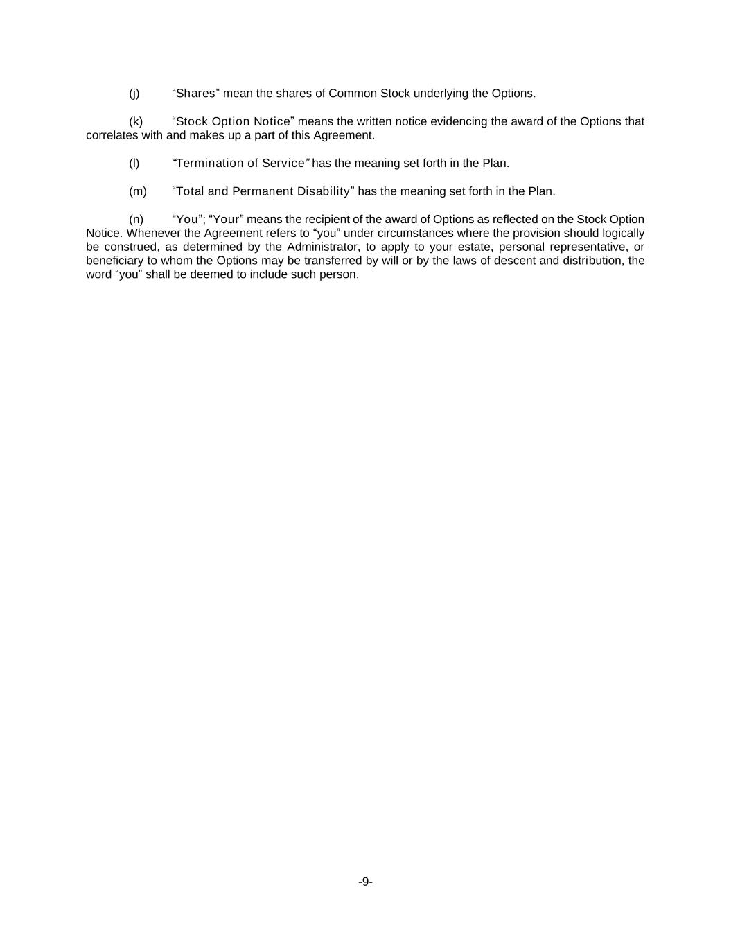 -9- (j) “Shares” mean the shares of Common Stock underlying the Options. (k) “Stock Option Notice” means the written notice evidencing the award of the Options that correlates with and makes up a part of this Agreement. (l) “Termination of Service” has the meaning set forth in the Plan. (m) “Total and Permanent Disability” has the meaning set forth in the Plan. (n) “You”; “Your” means the recipient of the award of Options as reflected on the Stock Option Notice. Whenever the Agreement refers to “you” under circumstances where the provision should logically be construed, as determined by the Administrator, to apply to your estate, personal representative, or beneficiary to whom the Options may be transferred by will or by the laws of descent and distribution, the word “you” shall be deemed to include such person.