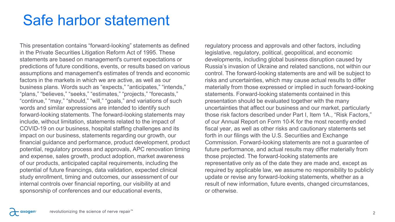 2 This presentation contains “forward-looking” statements as defined in the Private Securities Litigation Reform Act of 1995. These statements are based on management's current expectations or predictions of future conditions, events, or results based on various assumptions and management's estimates of trends and economic factors in the markets in which we are active, as well as our business plans. Words such as “expects,” “anticipates,” “intends,” “plans,” “believes,” “seeks,” “estimates,” “projects,” “forecasts,” “continue,” “may,” “should,” “will,” “goals,” and variations of such words and similar expressions are intended to identify such forward-looking statements. The forward-looking statements may include, without limitation, statements related to the impact of COVID-19 on our business, hospital staffing challenges and its impact on our business, statements regarding our growth, our financial guidance and performance, product development, product potential, regulatory process and approvals, APC renovation timing and expense, sales growth, product adoption, market awareness of our products, anticipated capital requirements, including the potential of future financings, data validation, expected clinical study enrollment, timing and outcomes, our assessment of our internal controls over financial reporting, our visibility at and sponsorship of conferences and our educational events, regulatory process and approvals and other factors, including legislative, regulatory, political, geopolitical, and economic developments, including global business disruption caused by Russia’s invasion of Ukraine and related sanctions, not within our control. The forward-looking statements are and will be subject to risks and uncertainties, which may cause actual results to differ materially from those expressed or implied in such forward-looking statements. Forward-looking statements contained in this presentation should be evaluated together with the many uncertainties that affect our business and our market, particularly those risk factors described under Part I, Item 1A., “Risk Factors,” of our Annual Report on Form 10-K for the most recently ended fiscal year, as well as other risks and cautionary statements set forth in our filings with the U.S. Securities and Exchange Commission. Forward-looking statements are not a guarantee of future performance, and actual results may differ materially from those projected. The forward-looking statements are representative only as of the date they are made and, except as required by applicable law, we assume no responsibility to publicly update or revise any forward-looking statements, whether as a result of new information, future events, changed circumstances, or otherwise. Safe harbor statement revolutionizing the science of nerve repair™