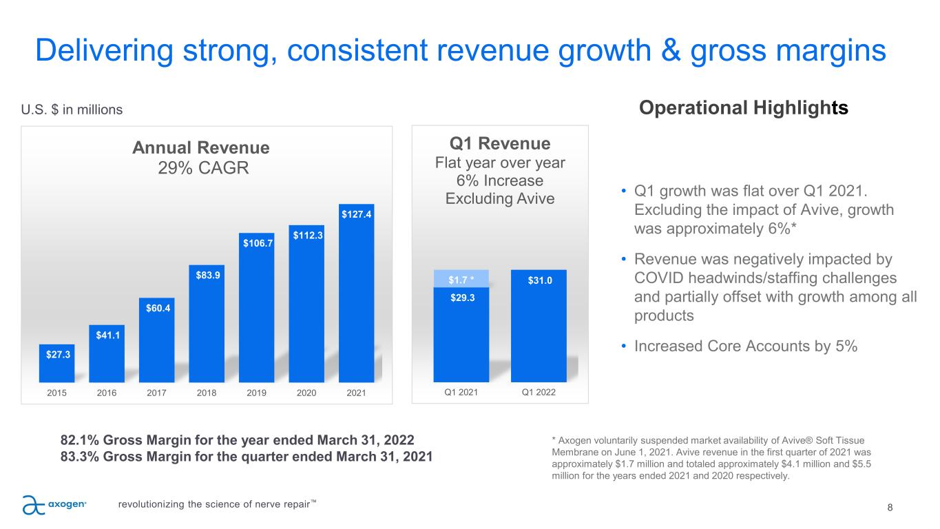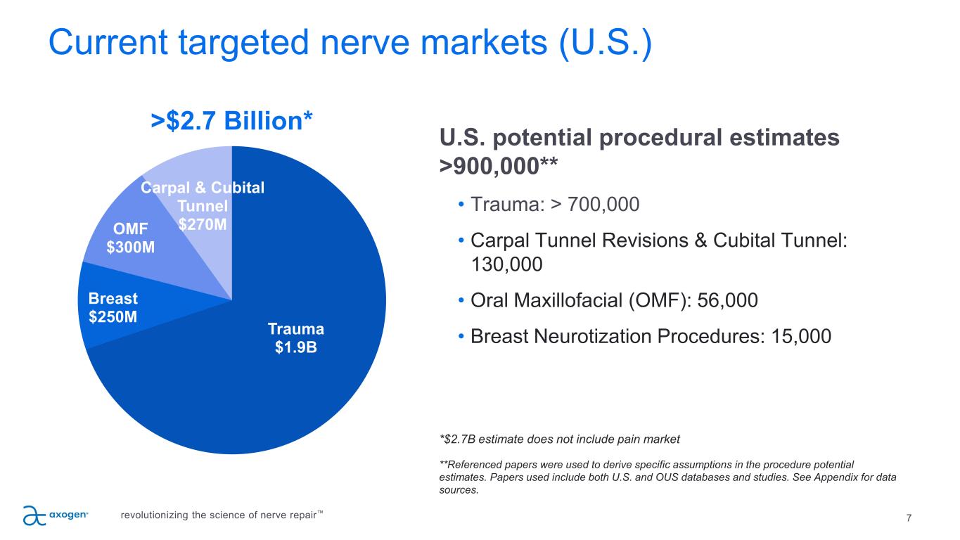 Axogen is the preeminent nerve repair company with a foundation for long-term sustainable growth 6 • Exclusively focused on peripheral nerve repair with a differentiated platform • 10+ years of demonstrated clinical outcome consistency • Featured in 188 peer-reviewed clinical publications • Over 50,000 Avance® Nerve Grafts implanted • Significant barriers to competitive entry • FDA granted Avance Regenerative Medicine Advanced Therapy (RMAT) designation • Commercial and surgeon education capabilities • Solid balance sheet provides resources to execute business plan • Experienced management team with strong track record of success revolutionizing the science of nerve repair™
