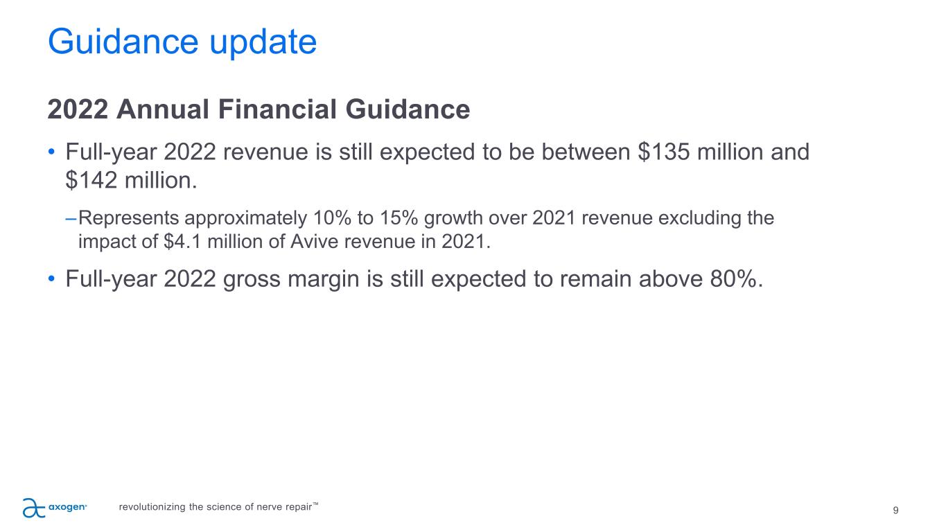 Guidance update 9 2022 Annual Financial Guidance • Full-year 2022 revenue is still expected to be between $135 million and $142 million. –Represents approximately 10% to 15% growth over 2021 revenue excluding the impact of $4.1 million of Avive revenue in 2021. • Full-year 2022 gross margin is still expected to remain above 80%. revolutionizing the science of nerve repair™