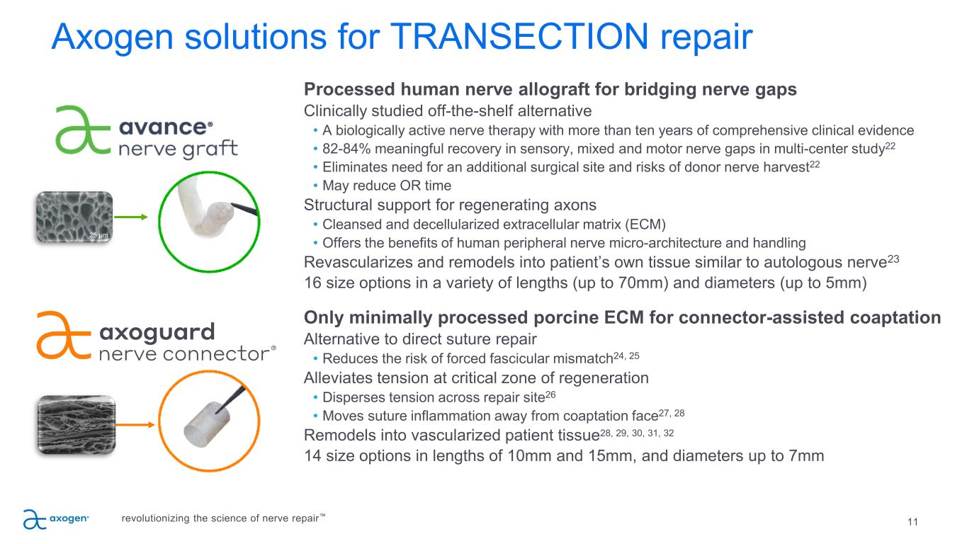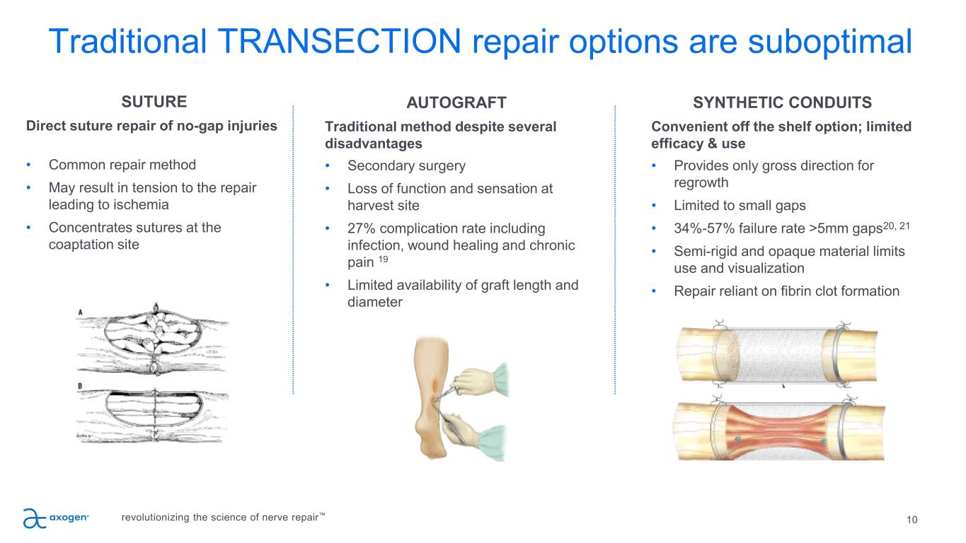 Traditional TRANSECTION repair options are suboptimal 10 SUTURE Direct suture repair of no-gap injuries • Common repair method • May result in tension to the repair leading to ischemia • Concentrates sutures at the coaptation site AUTOGRAFT Traditional method despite several disadvantages • Secondary surgery • Loss of function and sensation at harvest site • 27% complication rate including infection, wound healing and chronic pain 19 • Limited availability of graft length and diameter SYNTHETIC CONDUITS Convenient off the shelf option; limited efficacy & use • Provides only gross direction for regrowth • Limited to small gaps • 34%-57% failure rate >5mm gaps20, 21 • Semi-rigid and opaque material limits use and visualization • Repair reliant on fibrin clot formation revolutionizing the science of nerve repair™