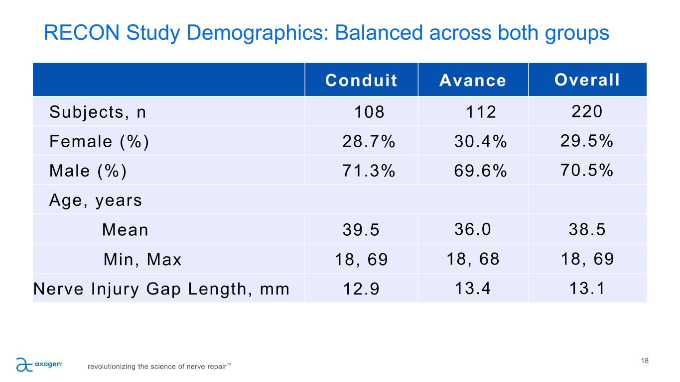 RECONSM: A Multicenter, Prospective, Randomized, Subject & Evaluator Blinded Comparative Study of Nerve Cuffs & Avance Nerve Graft Evaluating Recovery Outcomes for the Repair of Nerve Discontinuities revolutionizing the science of nerve repair™ 17 Safety & efficacy non- inferiority comparison of Avance vs conduit Evaluated upper extremity digital nerve repair for nerve gaps 5-25mm 220 subjects from up to 25 U.S. centers stratified into gap lengths with two-thirds in the 5-14mm group and one- third in the 15-25mm group 17