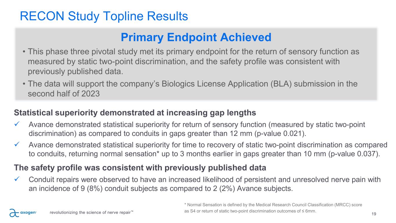 RECON Study Demographics: Balanced across both groups revolutionizing the science of nerve repair™ 18 Conduit Avance Overall Subjects, n 108 112 220 Female (%) 28.7% 30.4% 29.5% Male (%) 71.3% 69.6% 70.5% Age, years Mean 39.5 36.0 38.5 Min, Max 18, 69 18, 68 18, 69 Nerve Injury Gap Length, mm 12.9 13.4 13.1 18