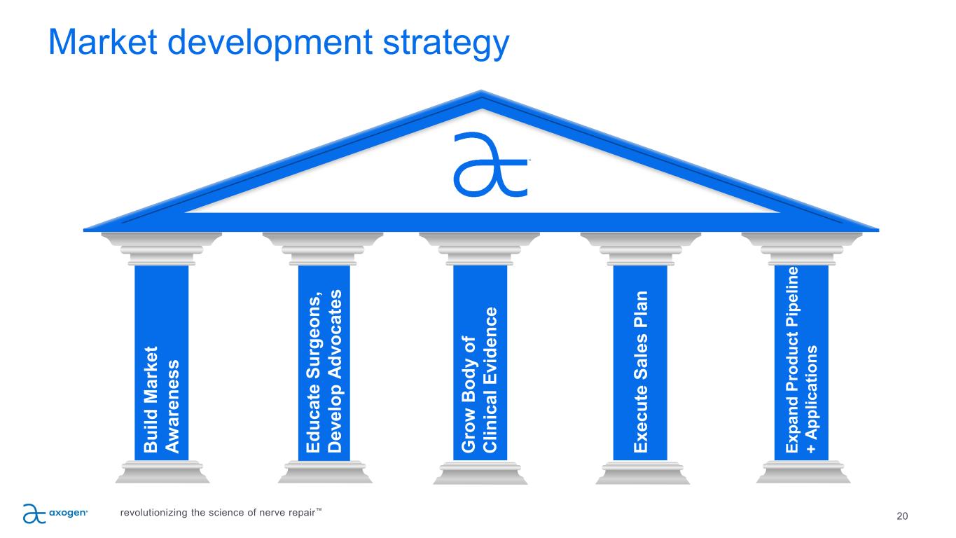 43 Footnotes Trauma Market Data: 1. National Hospital Ambulatory Medical Care Survey: 2015 Emergency Department Summary Tables – Table 18. https://www.cdc.gov/nchs/data/nhamcs/web_tables/2015_ed_web_tables.pdf 2. Noble, et al.. Analysis of Upper and Lower Extremity Peripheral Nerve Injuries in a Population of Patients with Multiple Injuries. J Trauma. 1998; 45(1): 116-122. 3. Uzun, et al., Traumatic peripheral nerve injuries: demographic and electrophysiologic findings of 802 patients from a developing country. J Clin Neuromusc Dis. 2006; 7(3): 97–103. 4. Portincasa, et al. Microsurgical treatment of injury to peripheral nerves in upper and lower limbs: a critical review of the last 8 years. Microsurgery. 2007; 27(5): 455–462. Carpal Tunnel Revisions & Cubital Tunnel Market Data 5. Medicare National HCPS Aggregate Summary Table CY2016. https://data.cms.gov/Medicare-Physician-Supplier/Medicare-National-HCPCS-Aggregate-Summary-Table-CY/jtra-d83c/data 6. Sotereanos, et al. Vein wrapping for the treatment of recurrent carpal tunnel syndrome. Tech Hand Up Extrem Surg.1997; 1(1):35-40. 7. Seradge, et al. Cubital tunnel release with medial epicondylectomy factors influencing the outcome. J Hand Surg Am. 1998; 23(3): 483-491. 8. Papatheodorou, et al. Preliminary results of recurrent cubital tunnel syndrome treated with neurolysis and porcine extracellular matrix nerve wrap. J Hand Surg Am. 2015; 40(5): 987-992 OMF Market Data 9. Lin, et al. Systematic Review and Meta-Analysis on Incidence of Altered Sensation of Mandibular Implant Surgery - PLoS One. 2016; 11(4): e0154082. 10. Hussaini. Procedure frequency in the jaws related to implant location. Dent Oral Craniofac Res. 2016; 2(2): 230-233. 11. Nguyen, et al. Risk factors for permanent injury of inferior alveolar and lingual nerves during third molar surgery. J Oral Maxillofac Surg. 2014; 72(12): 2394-2401. 12. Cheung, et al. Incidence of neurosensory deficits and recovery after lower third molar surgery: a prospective clinical study of 4338 cases. Int J Oral Maxillofac Surg. 2010; 39(4): 320–326. 13. Dental Implants Market (Product - Endosteal Implants, Subperiosteal Implants, Transosteal Implants, Intramucosal Implants; Material - Titanium Implants, Zirconium Implants; End User - Hospitals, Dental Clinics, and Academic & Research Institutes) - Global Industry Analysis, Size, Share, Growth, Trends, and Forecast 2017 – 2025. https://www.transparencymarketresearch.com/dental-implants-market.html 14. Cha, et al. Frequency of bone graft in implant surgery. Maxillofac Plast and Reconstr Surg. 2016; 38(1): 19. 15. Miloro, M (ed). Trigeminal Nerve Injuries. Springer; 2013. 16. Pogrel et al. Permanent nerve involvement resulting: From inferior alveolar nerve blocks. J Am Dent Assoc. 2000; 131(7): 901-907. 17. Agbaje, et al. Systematic review of the incidence of inferior alveolar nerve injury in bilateral sagittal split osteotomy and the assessment of neurosensory disturbances. Int. J Oral Maxillofac. Surg. 2015; 44(4): 447-451. Breast Neurotization Market Data 18. ASPS 2017– Plastic Surgery Statistics Report. www.plasticsurgery.org/documents/News/Statistics/2017/plastic-surgery-statistics-full-report-2017.pdf 19. Rappaport, et al. Clinical utilization and complications of sural nerve biopsy. Am J Surg. 1993; 166(3): 252-256. 20. Weber, et al. A randomized prospective study of polyglycolic acid conduits for digital nerve reconstruction in humans. Plast Reconstr Surg. 2000; 106(5): 1036-1045. 21. Wangensteen, et al. Collagen tube conduits in peripheral nerve repair: A retrospective analysis. Hand. 2010; 5(3): 273-277. 22. Data on file at Axogen 23. Karabekmez, et al. Early clinical outcomes with the use of decellularized nerve allograft for repair of sensory defects within the hand. Hand. 2009; 4(3): 245-249. 24. Boeckstyns, et al. Collagen conduit versus microsurgical neurorrhaphy: 2-year follow-up of a prospective, blinded clinical and electrophysiological multicenter randomized, controlled trial. J hand Surg Am. 2013; 38(12): 2405-2411. 25. Brushart, et al. Selective reinnervation of distal motor stumps by peripheral motor axons. Exp Neurol. 1987; 97(2): 289-300. 26. Schmidhammer, et al. Alleviated tension at the repair site enhances functional regeneration: The effect of full range of motion mobilization on the regeneration of peripheral nerves--histologic, electrophysiologic, and functional results in a rat model. J Trauma. 2004; 56(3): 571-584 27. Tang, et al. The optimal number and location of sutures in conduit-assisted primary digital nerve repair. J Hand Surg Eur Vol. 2018; 43(6): 621-625. 28. Data on file at Axogen 29. Badylak, et al. Small intestinal submucosa: A substrate for in vitro cell growth. J Biomater Sci Polym Ed. 1998; 9(8): 863-878. 30. Hodde, et al. Effects of sterilization on an extracellular matrix scaffold: Part II. Bioactivity and matrix interaction. J Mater Sci Mater Med. 2007; 18(4): 545-550. 31. Nihsen, et al. Bioactivity of small intestinal submucosa and oxidized regenerated cellulose/collagen. Adv Skin Wound Care. 2008; 21(10): 479-486. 32. Zhukauskas et al., Comparative Study of Porcine Small Intestine Submucosa and Cross-Linked Bovine Type I Collagen as a Nerve Conduit. JHS GO 3(5), 282-288 Sep 2021 33. Hodde, et al. Vascular endothelial growth factor in porcine-derived extracellular matrix. Endothelium. 2001; 8(1): 11-24. 34. Data on file at Axogen 35. Kokkalis, et al. Assessment of processed porcine extracellular matrix as a protective barrier in a rabbit nerve wrap model. J Recon MicroSurg. 2011; 27(1): 19-28. 36. Pet MA, Ko JH, Friedly JL, Smith DG. Traction Neurectomy for Treatment of Painful Residual Limb Neuroma in Lower Extremity Amputees J Orthop Trauma. 29 (9), e321-5 Sep 2015. 37. Laborde K, et al. Results of surgical treatment of painful neuromas of the hand. The Journal of Hand Surgery. March 1981;7(2):190-193. revolutionizing the science of nerve repair™