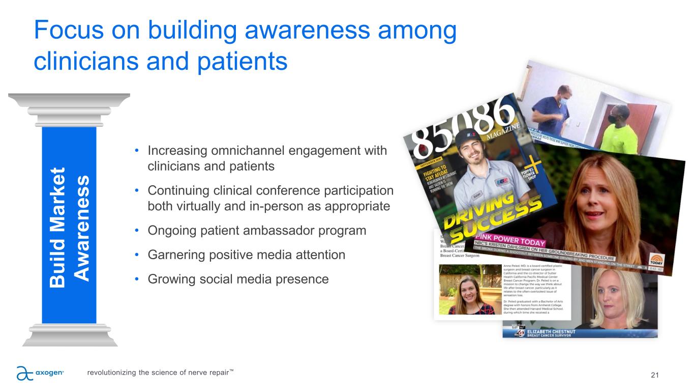 20 Market development strategy B ui ld M ar ke t Aw ar en es s Ed uc at e Su rg eo ns , D ev el op A dv oc at es G ro w B od y of C lin ic al E vi de nc e Ex ec ut e Sa le s Pl an Ex pa nd P ro du ct P ip el in e + Ap pl ic at io ns revolutionizing the science of nerve repair™