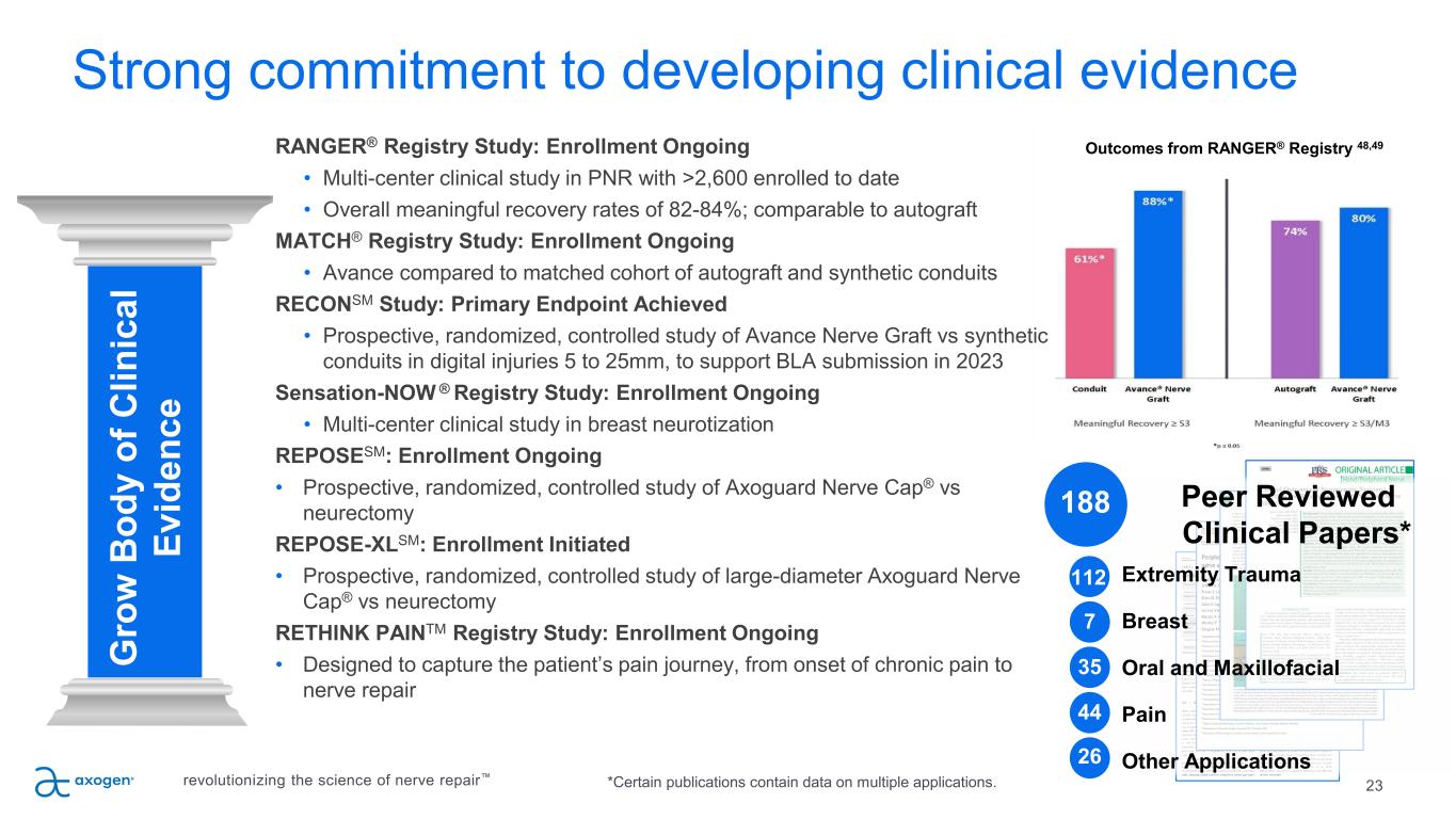22 P IL L A R 2 Emphasis on education • Returned to in-person national education programs in September 2021 • Providing customized multimodal learning programs to specific surgeon cohorts for advanced learning • Ongoing interactive webinar series covering the principles of nerve repair • Train more than three-quarters of all hand and micro-surgery fellows annuallyEd uc at e Su rg eo ns , D ev el op A dv oc at es revolutionizing the science of nerve repair™