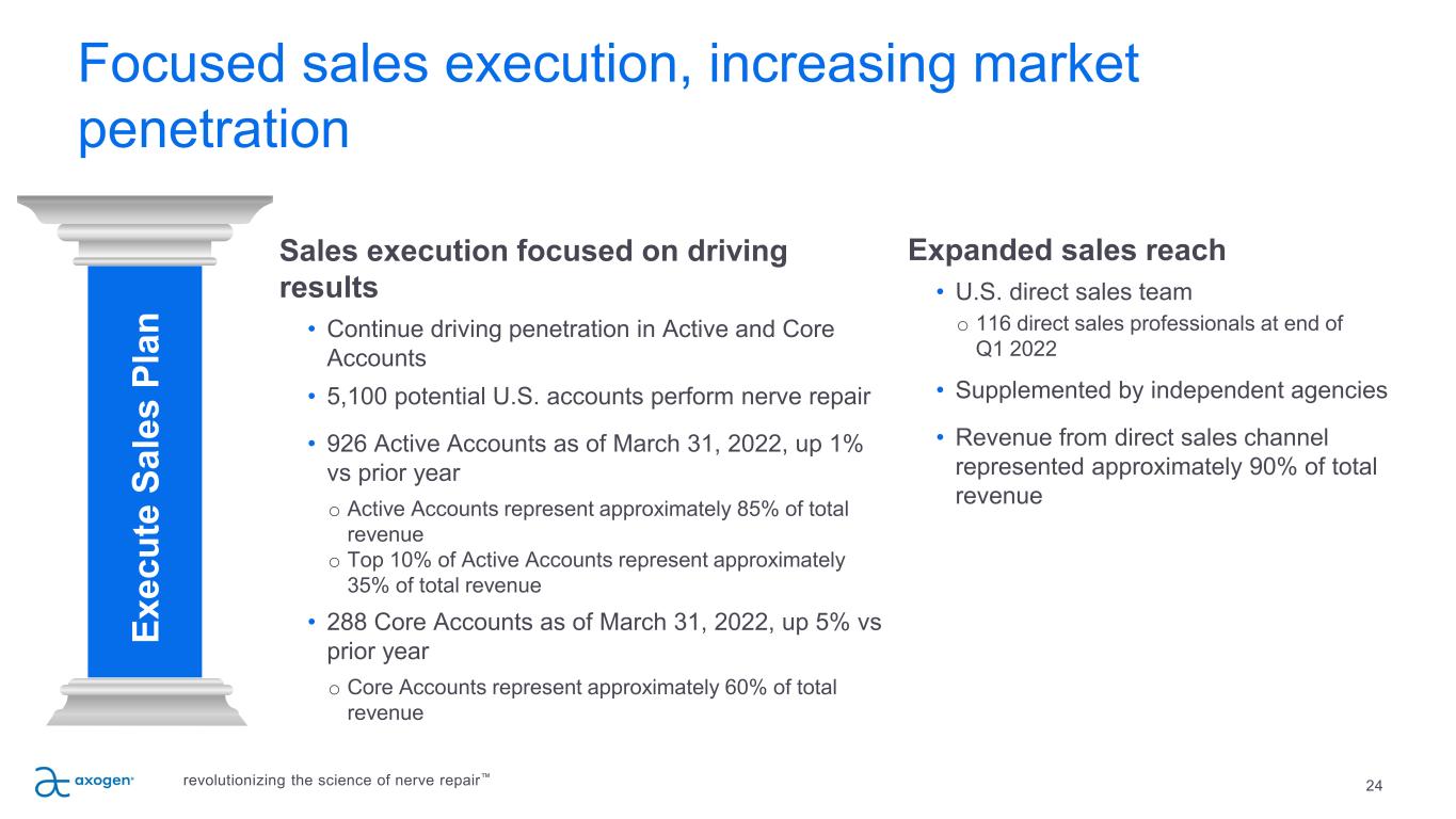 Outcomes from RANGER® Registry 48,49 23 P IL L A R 3 Strong commitment to developing clinical evidence RANGER® Registry Study: Enrollment Ongoing • Multi-center clinical study in PNR with >2,600 enrolled to date • Overall meaningful recovery rates of 82-84%; comparable to autograft MATCH® Registry Study: Enrollment Ongoing • Avance compared to matched cohort of autograft and synthetic conduits RECONSM Study: Primary Endpoint Achieved • Prospective, randomized, controlled study of Avance Nerve Graft vs synthetic conduits in digital injuries 5 to 25mm, to support BLA submission in 2023 Sensation-NOW ® Registry Study: Enrollment Ongoing • Multi-center clinical study in breast neurotization REPOSESM: Enrollment Ongoing • Prospective, randomized, controlled study of Axoguard Nerve Cap® vs neurectomy REPOSE-XLSM: Enrollment Initiated • Prospective, randomized, controlled study of large-diameter Axoguard Nerve Cap® vs neurectomy RETHINK PAINTM Registry Study: Enrollment Ongoing • Designed to capture the patient’s pain journey, from onset of chronic pain to nerve repair G ro w B od y of C lin ic al Ev id en ce Peer Reviewed Clinical Papers* Extremity Trauma Breast Oral and Maxillofacial Pain Other Applications revolutionizing the science of nerve repair™ 112 7 35 44 26 188 *Certain publications contain data on multiple applications.