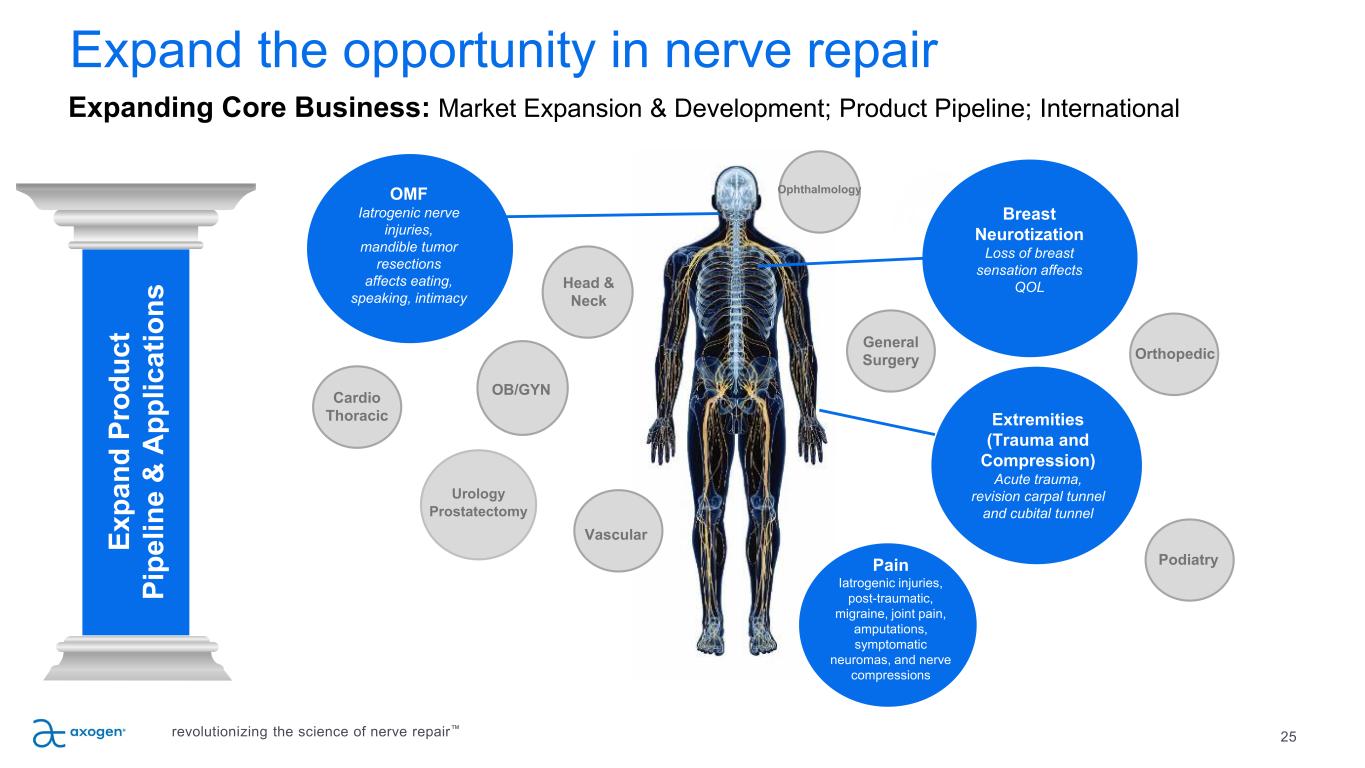 24 P IL L A R 4 Focused sales execution, increasing market penetration P IL L A R 3 Ex ec ut e Sa le s Pl an Sales execution focused on driving results • Continue driving penetration in Active and Core Accounts • 5,100 potential U.S. accounts perform nerve repair • 926 Active Accounts as of March 31, 2022, up 1% vs prior year o Active Accounts represent approximately 85% of total revenue o Top 10% of Active Accounts represent approximately 35% of total revenue • 288 Core Accounts as of March 31, 2022, up 5% vs prior year o Core Accounts represent approximately 60% of total revenue Expanded sales reach • U.S. direct sales team o 116 direct sales professionals at end of Q1 2022 • Supplemented by independent agencies • Revenue from direct sales channel represented approximately 90% of total revenue revolutionizing the science of nerve repair™