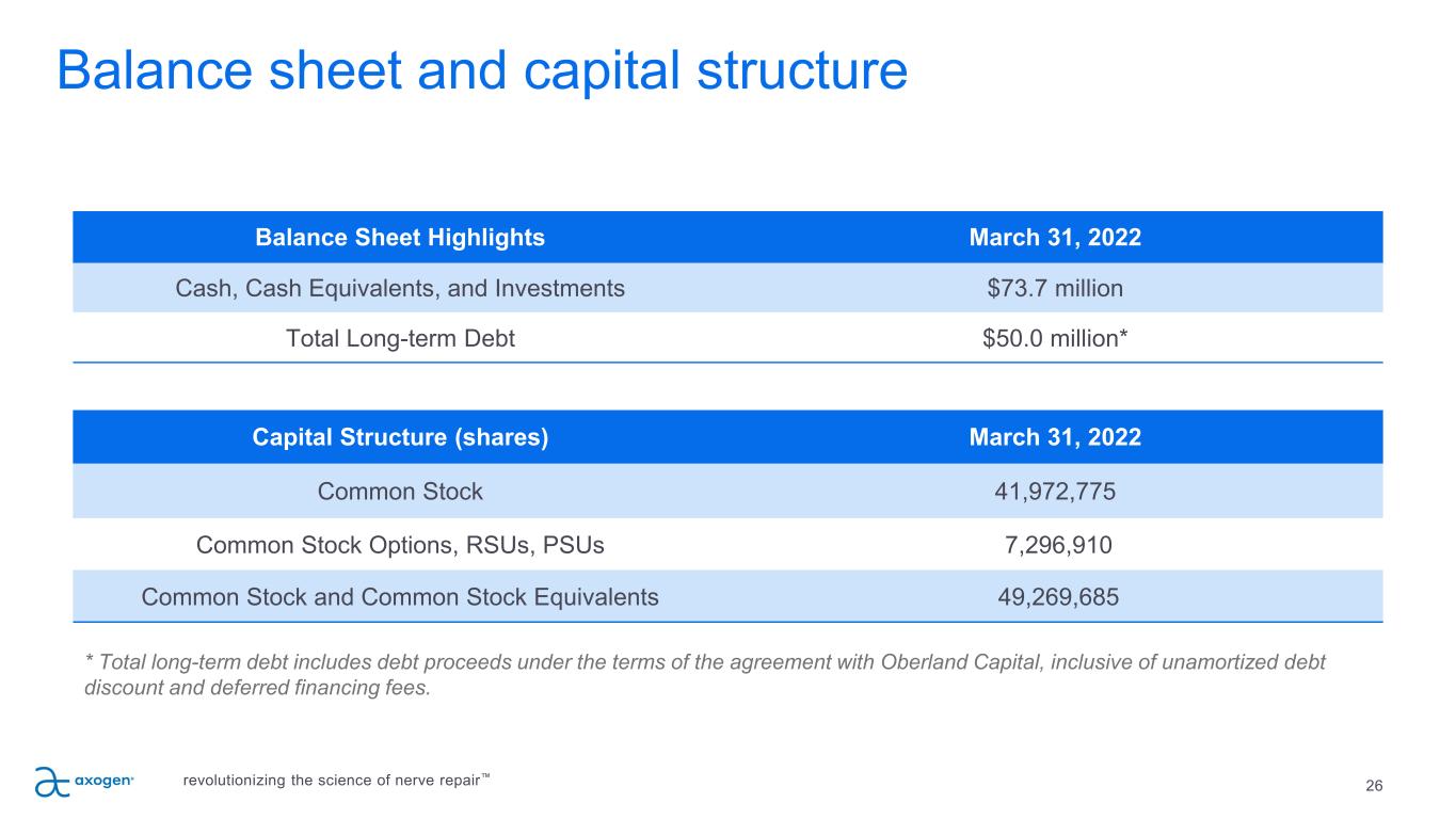 25 P IL L A R 5 Expand the opportunity in nerve repair P IL L A R 4 P IL L A R 3 Ex pa nd P ro du ct Pi pe lin e & A pp lic at io ns Breast Neurotization Loss of breast sensation affects QOL Urology Prostatectomy OMF Iatrogenic nerve injuries, mandible tumor resections affects eating, speaking, intimacy Extremities (Trauma and Compression) Acute trauma, revision carpal tunnel and cubital tunnel Head & Neck OB/GYN General Surgery Cardio Thoracic Orthopedic Podiatry Vascular Pain Iatrogenic injuries, post-traumatic, migraine, joint pain, amputations, symptomatic neuromas, and nerve compressions Ophthalmology Expanding Core Business: Market Expansion & Development; Product Pipeline; International revolutionizing the science of nerve repair™