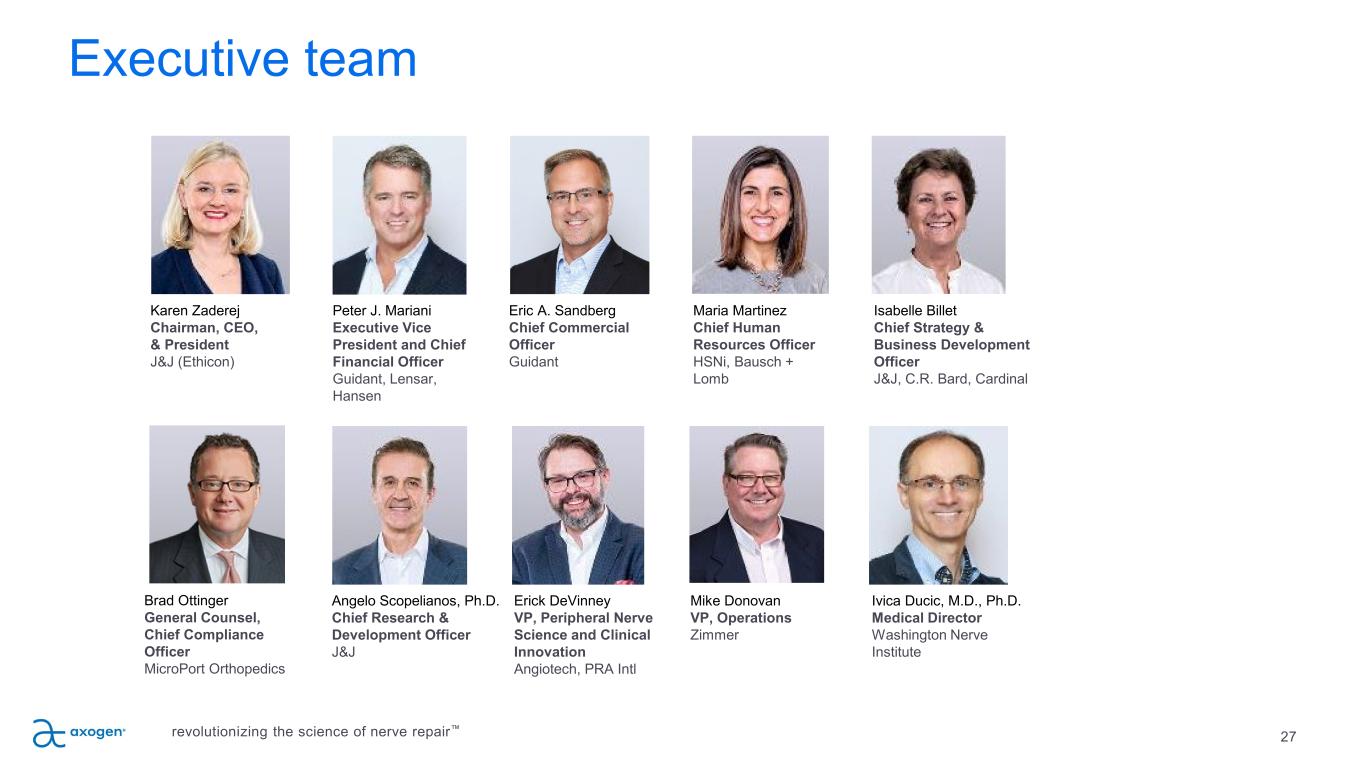 26 Balance Sheet Highlights March 31, 2022 Cash, Cash Equivalents, and Investments $73.7 million Total Long-term Debt $50.0 million* Capital Structure (shares) March 31, 2022 Common Stock 41,972,775 Common Stock Options, RSUs, PSUs 7,296,910 Common Stock and Common Stock Equivalents 49,269,685 Balance sheet and capital structure * Total long-term debt includes debt proceeds under the terms of the agreement with Oberland Capital, inclusive of unamortized debt discount and deferred financing fees. revolutionizing the science of nerve repair™