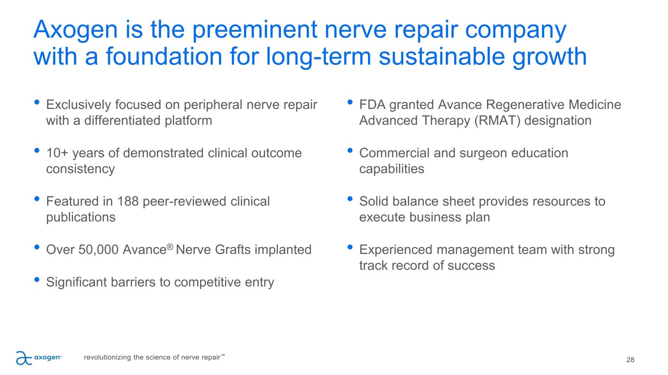 Axogen is the preeminent nerve repair company with a foundation for long-term sustainable growth 28 • Exclusively focused on peripheral nerve repair with a differentiated platform • 10+ years of demonstrated clinical outcome consistency • Featured in 188 peer-reviewed clinical publications • Over 50,000 Avance® Nerve Grafts implanted • Significant barriers to competitive entry • FDA granted Avance Regenerative Medicine Advanced Therapy (RMAT) designation • Commercial and surgeon education capabilities • Solid balance sheet provides resources to execute business plan • Experienced management team with strong track record of success revolutionizing the science of nerve repair™