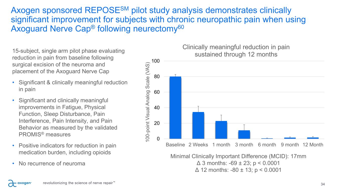 Axogen sponsored REPOSESM pilot study analysis demonstrates clinically significant improvement for subjects with chronic neuropathic pain when using Axoguard Nerve Cap® following neurectomy60 34 15-subject, single arm pilot phase evaluating reduction in pain from baseline following surgical excision of the neuroma and placement of the Axoguard Nerve Cap • Significant & clinically meaningful reduction in pain • Significant and clinically meaningful improvements in Fatigue, Physical Function, Sleep Disturbance, Pain Interference, Pain Intensity, and Pain Behavior as measured by the validated PROMIS® measures • Positive indicators for reduction in pain medication burden, including opioids • No recurrence of neuroma 0 20 40 60 80 100 Baseline 2 Weeks 1 month 3 month 6 month 9 month 12 Month 10 0- po in t V is ua l A na lo g Sc al e (V AS ) Clinically meaningful reduction in pain sustained through 12 months Minimal Clinically Important Difference (MCID): 17mm Δ 3 months: -69 ± 23; p < 0.0001 Δ 12 months: -80 ± 13; p < 0.0001 revolutionizing the science of nerve repair™