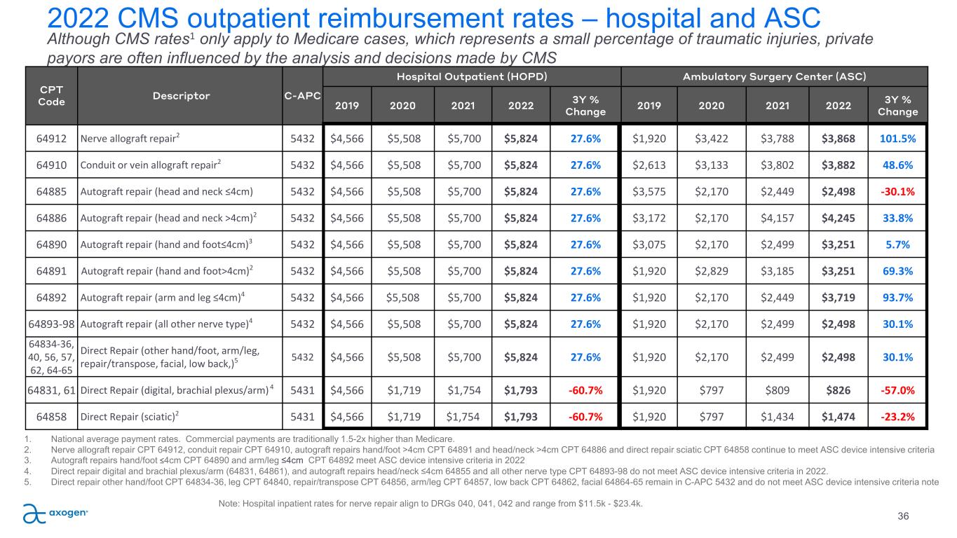 CPT Code Descriptor C-APC Hospital Outpatient (HOPD) Ambulatory Surgery Center (ASC) 2019 2020 2021 2022 3Y % Change 2019 2020 2021 2022 3Y % Change 64912 Nerve allograft repair2 5432 $4,566 $5,508 $5,700 $5,824 27.6% $1,920 $3,422 $3,788 $3,868 101.5% 64910 Conduit or vein allograft repair2 5432 $4,566 $5,508 $5,700 $5,824 27.6% $2,613 $3,133 $3,802 $3,882 48.6% 64885 Autograft repair (head and neck ≤4cm) 5432 $4,566 $5,508 $5,700 $5,824 27.6% $3,575 $2,170 $2,449 $2,498 -30.1% 64886 Autograft repair (head and neck >4cm)2 5432 $4,566 $5,508 $5,700 $5,824 27.6% $3,172 $2,170 $4,157 $4,245 33.8% 64890 Autograft repair (hand and foot≤4cm)3 5432 $4,566 $5,508 $5,700 $5,824 27.6% $3,075 $2,170 $2,499 $3,251 5.7% 64891 Autograft repair (hand and foot>4cm)2 5432 $4,566 $5,508 $5,700 $5,824 27.6% $1,920 $2,829 $3,185 $3,251 69.3% 64892 Autograft repair (arm and leg ≤4cm)4 5432 $4,566 $5,508 $5,700 $5,824 27.6% $1,920 $2,170 $2,449 $3,719 93.7% 64893-98 Autograft repair (all other nerve type)4 5432 $4,566 $5,508 $5,700 $5,824 27.6% $1,920 $2,170 $2,499 $2,498 30.1% 64834-36, 40, 56, 57, 62, 64-65 Direct Repair (other hand/foot, arm/leg, repair/transpose, facial, low back,)5 5432 $4,566 $5,508 $5,700 $5,824 27.6% $1,920 $2,170 $2,499 $2,498 30.1% 64831, 61 Direct Repair (digital, brachial plexus/arm) 4 5431 $4,566 $1,719 $1,754 $1,793 -60.7% $1,920 $797 $809 $826 -57.0% 64858 Direct Repair (sciatic)2 5431 $4,566 $1,719 $1,754 $1,793 -60.7% $1,920 $797 $1,434 $1,474 -23.2% 2022 CMS outpatient reimbursement rates – hospital and ASC 36 Although CMS rates1 only apply to Medicare cases, which represents a small percentage of traumatic injuries, private payors are often influenced by the analysis and decisions made by CMS 1. National average payment rates. Commercial payments are traditionally 1.5-2x higher than Medicare. 2. Nerve allograft repair CPT 64912, conduit repair CPT 64910, autograft repairs hand/foot >4cm CPT 64891 and head/neck >4cm CPT 64886 and direct repair sciatic CPT 64858 continue to meet ASC device intensive criteria 3. Autograft repairs hand/foot ≤4cm CPT 64890 and arm/leg ≤4cm CPT 64892 meet ASC device intensive criteria in 2022 4. Direct repair digital and brachial plexus/arm (64831, 64861), and autograft repairs head/neck ≤4cm 64855 and all other nerve type CPT 64893-98 do not meet ASC device intensive criteria in 2022. 5. Direct repair other hand/foot CPT 64834-36, leg CPT 64840, repair/transpose CPT 64856, arm/leg CPT 64857, low back CPT 64862, facial 64864-65 remain in C-APC 5432 and do not meet ASC device intensive criteria note Note: Hospital inpatient rates for nerve repair align to DRGs 040, 041, 042 and range from $11.5k - $23.4k.