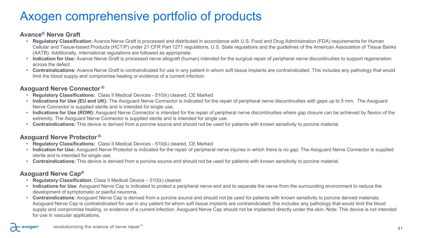 Axogen comprehensive portfolio of products Avance® Nerve Graft • Regulatory Classification: Avance Nerve Graft is processed and distributed in accordance with U.S. Food and Drug Administration (FDA) requirements for Human Cellular and Tissue-based Products (HCT/P) under 21 CFR Part 1271 regulations, U.S. State regulations and the guidelines of the American Association of Tissue Banks (AATB). Additionally, international regulations are followed as appropriate. • Indication for Use: Avance Nerve Graft is processed nerve allograft (human) intended for the surgical repair of peripheral nerve discontinuities to support regeneration across the defect. • Contraindications: Avance Nerve Graft is contraindicated for use in any patient in whom soft tissue implants are contraindicated. This includes any pathology that would limit the blood supply and compromise healing or evidence of a current infection. Axoguard Nerve Connector ® • Regulatory Classifications: Class II Medical Devices - 510(k) cleared, CE Marked • Indications for Use (EU and UK): The Axoguard Nerve Connector is indicated for the repair of peripheral nerve discontinuities with gaps up to 5 mm. The Axoguard Nerve Connector is supplied sterile and is intended for single use. • Indications for Use (ROW): Axoguard Nerve Connector is intended for the repair of peripheral nerve discontinuities where gap closure can be achieved by flexion of the extremity. The Axoguard Nerve Connector is supplied sterile and is intended for single use. • Contraindications: This device is derived from a porcine source and should not be used for patients with known sensitivity to porcine material. Axoguard Nerve Protector ® • Regulatory Classifications: Class II Medical Devices - 510(k) cleared, CE Marked • Indication for Use: Axoguard Nerve Protector is indicated for the repair of peripheral nerve injuries in which there is no gap. The Axoguard Nerve Connector is supplied sterile and is intended for single use. • Contraindications: This device is derived from a porcine source and should not be used for patients with known sensitivity to porcine material. Axoguard Nerve Cap® • Regulatory Classification: Class II Medical Device – 510(k) cleared • Indications for Use: Axoguard Nerve Cap is indicated to protect a peripheral nerve end and to separate the nerve from the surrounding environment to reduce the development of symptomatic or painful neuroma. • Contraindications: Axoguard Nerve Cap is derived from a porcine source and should not be used for patients with known sensitivity to porcine derived materials. Axoguard Nerve Cap is contraindicated for use in any patient for whom soft tissue implants are contraindicated; this includes any pathology that would limit the blood supply and compromise healing, or evidence of a current infection. Axoguard Nerve Cap should not be implanted directly under the skin. Note: This device is not intended for use in vascular applications. 41revolutionizing the science of nerve repair™