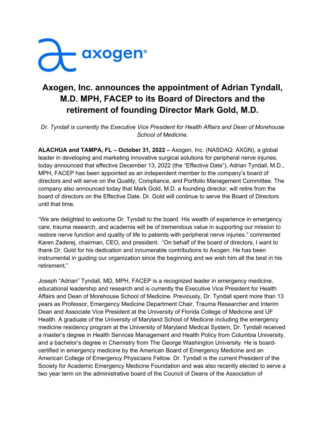Axogen, Inc. announces the appointment of Adrian Tyndall, M.D. MPH, FACEP to its Board of Directors and the retirement of founding Director Mark Gold, M.D. Dr. Tyndall is currently the Executive Vice President for Health Affairs and Dean of Morehouse School of Medicine. ALACHUA and TAMPA, FL – October 31, 2022 – Axogen, Inc. (NASDAQ: AXGN), a global leader in developing and marketing innovative surgical solutions for peripheral nerve injuries, today announced that effective December 13, 2022 (the “Effective Date”), Adrian Tyndall, M.D., MPH, FACEP has been appointed as an independent member to the company’s board of directors and will serve on the Quality, Compliance, and Portfolio Management Committee. The company also announced today that Mark Gold, M.D. a founding director, will retire from the board of directors on the Effective Date. Dr. Gold will continue to serve the Board of Directors until that time. “We are delighted to welcome Dr. Tyndall to the board. His wealth of experience in emergency care, trauma research, and academia will be of tremendous value in supporting our mission to restore nerve function and quality of life to patients with peripheral nerve injuries.” commented Karen Zaderej, chairman, CEO, and president. “On behalf of the board of directors, I want to thank Dr. Gold for his dedication and innumerable contributions to Axogen. He has been instrumental in guiding our organization since the beginning and we wish him all the best in his retirement,” Joseph “Adrian” Tyndall, MD, MPH, FACEP is a recognized leader in emergency medicine, educational leadership and research and is currently the Executive Vice President for Health Affairs and Dean of Morehouse School of Medicine. Previously, Dr. Tyndall spent more than 13 years as Professor, Emergency Medicine Department Chair, Trauma Researcher and Interim Dean and Associate Vice President at the University of Florida College of Medicine and UF Health. A graduate of the University of Maryland School of Medicine including the emergency medicine residency program at the University of Maryland Medical System, Dr. Tyndall received a master’s degree in Health Services Management and Health Policy from Columbia University, and a bachelor’s degree in Chemistry from The George Washington University. He is board- certified in emergency medicine by the American Board of Emergency Medicine and an American College of Emergency Physicians Fellow. Dr. Tyndall is the current President of the Society for Academic Emergency Medicine Foundation and was also recently elected to serve a two year term on the administrative board of the Council of Deans of the Association of