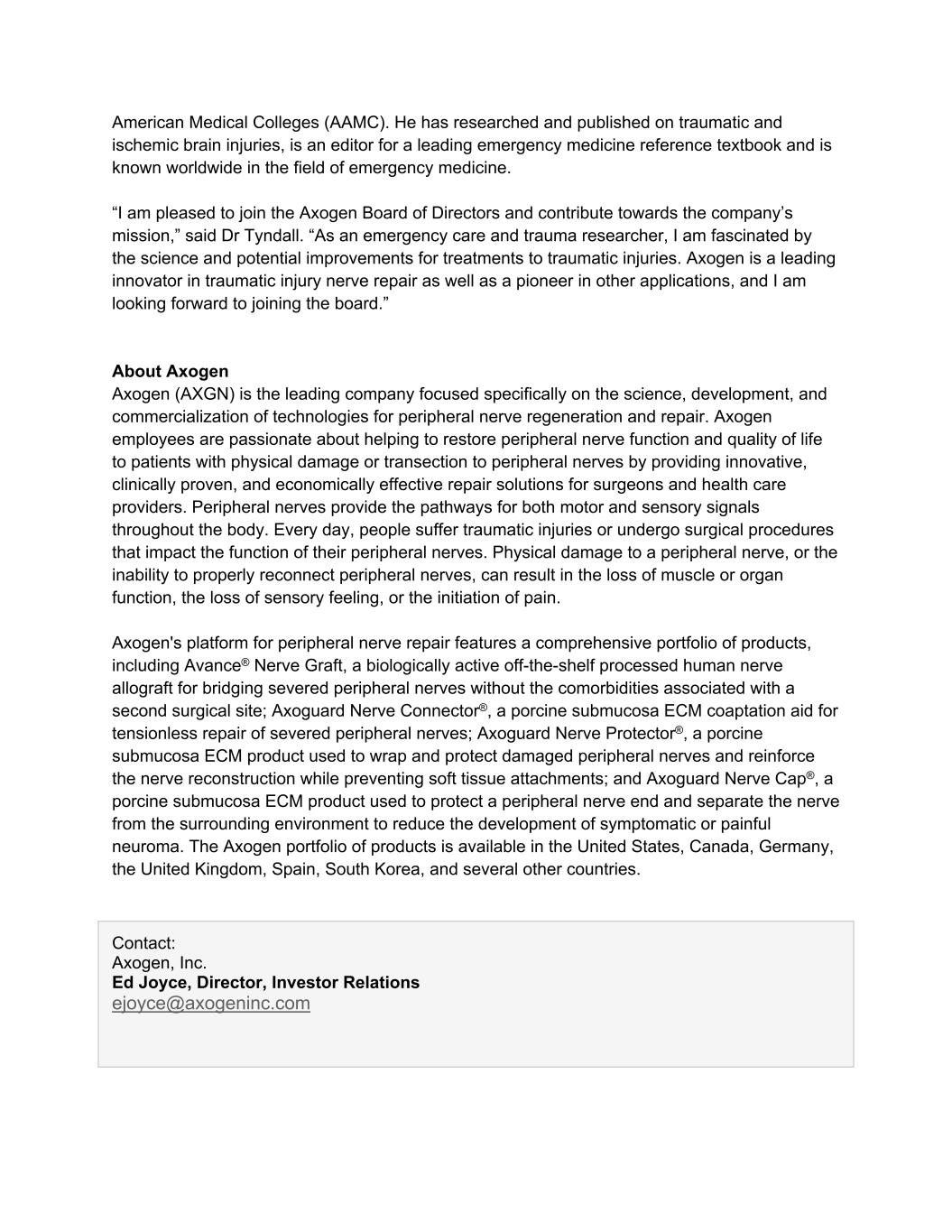 American Medical Colleges (AAMC). He has researched and published on traumatic and ischemic brain injuries, is an editor for a leading emergency medicine reference textbook and is known worldwide in the field of emergency medicine. “I am pleased to join the Axogen Board of Directors and contribute towards the company’s mission,” said Dr Tyndall. “As an emergency care and trauma researcher, I am fascinated by the science and potential improvements for treatments to traumatic injuries. Axogen is a leading innovator in traumatic injury nerve repair as well as a pioneer in other applications, and I am looking forward to joining the board.” About Axogen Axogen (AXGN) is the leading company focused specifically on the science, development, and commercialization of technologies for peripheral nerve regeneration and repair. Axogen employees are passionate about helping to restore peripheral nerve function and quality of life to patients with physical damage or transection to peripheral nerves by providing innovative, clinically proven, and economically effective repair solutions for surgeons and health care providers. Peripheral nerves provide the pathways for both motor and sensory signals throughout the body. Every day, people suffer traumatic injuries or undergo surgical procedures that impact the function of their peripheral nerves. Physical damage to a peripheral nerve, or the inability to properly reconnect peripheral nerves, can result in the loss of muscle or organ function, the loss of sensory feeling, or the initiation of pain. Axogen's platform for peripheral nerve repair features a comprehensive portfolio of products, including Avance® Nerve Graft, a biologically active off-the-shelf processed human nerve allograft for bridging severed peripheral nerves without the comorbidities associated with a second surgical site; Axoguard Nerve Connector®, a porcine submucosa ECM coaptation aid for tensionless repair of severed peripheral nerves; Axoguard Nerve Protector®, a porcine submucosa ECM product used to wrap and protect damaged peripheral nerves and reinforce the nerve reconstruction while preventing soft tissue attachments; and Axoguard Nerve Cap®, a porcine submucosa ECM product used to protect a peripheral nerve end and separate the nerve from the surrounding environment to reduce the development of symptomatic or painful neuroma. The Axogen portfolio of products is available in the United States, Canada, Germany, the United Kingdom, Spain, South Korea, and several other countries. Contact: Axogen, Inc. Ed Joyce, Director, Investor Relations ejoyce@axogeninc.com