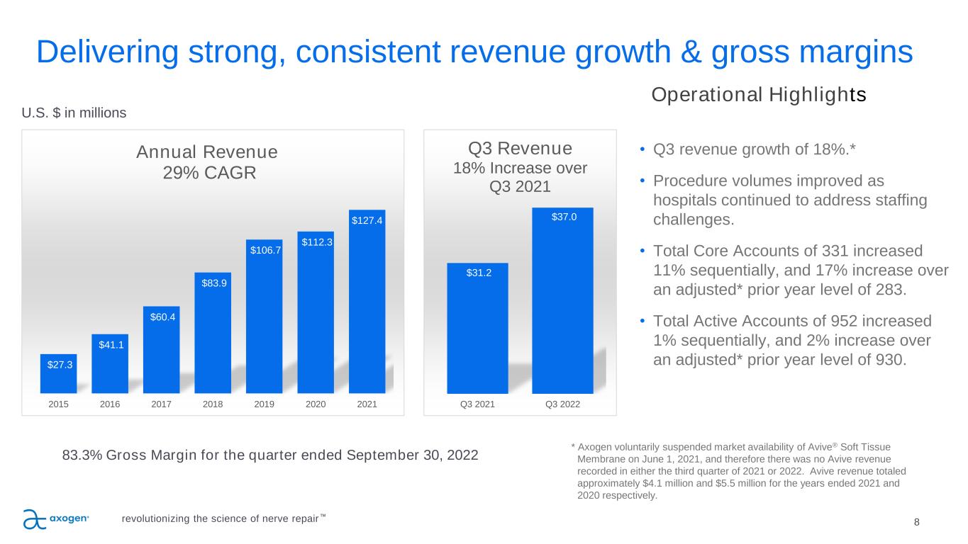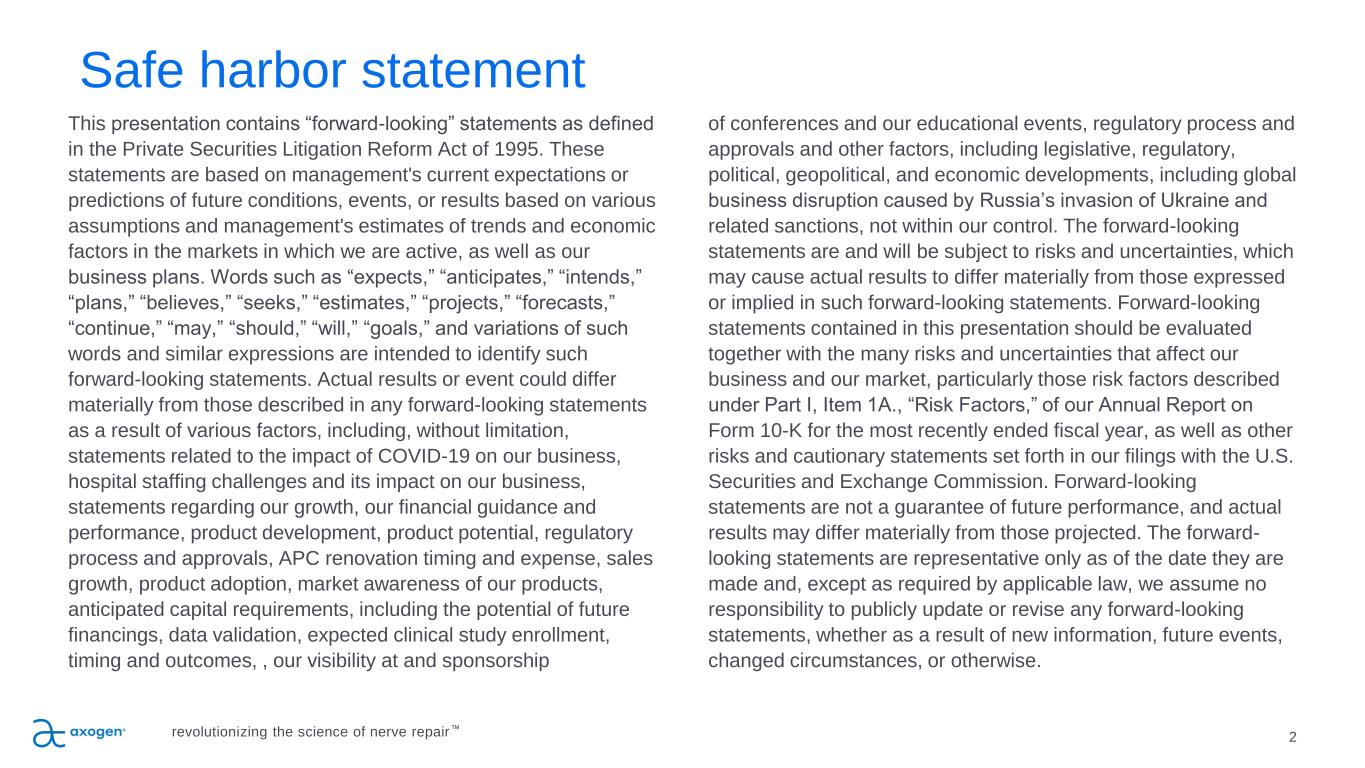 2 This presentation contains “forward-looking” statements as defined in the Private Securities Litigation Reform Act of 1995. These statements are based on management's current expectations or predictions of future conditions, events, or results based on various assumptions and management's estimates of trends and economic factors in the markets in which we are active, as well as our business plans. Words such as “expects,” “anticipates,” “intends,” “plans,” “believes,” “seeks,” “estimates,” “projects,” “forecasts,” “continue,” “may,” “should,” “will,” “goals,” and variations of such words and similar expressions are intended to identify such forward-looking statements. Actual results or event could differ materially from those described in any forward-looking statements as a result of various factors, including, without limitation, statements related to the impact of COVID-19 on our business, hospital staffing challenges and its impact on our business, statements regarding our growth, our financial guidance and performance, product development, product potential, regulatory process and approvals, APC renovation timing and expense, sales growth, product adoption, market awareness of our products, anticipated capital requirements, including the potential of future financings, data validation, expected clinical study enrollment, timing and outcomes, , our visibility at and sponsorship of conferences and our educational events, regulatory process and approvals and other factors, including legislative, regulatory, political, geopolitical, and economic developments, including global business disruption caused by Russia’s invasion of Ukraine and related sanctions, not within our control. The forward-looking statements are and will be subject to risks and uncertainties, which may cause actual results to differ materially from those expressed or implied in such forward-looking statements. Forward-looking statements contained in this presentation should be evaluated together with the many risks and uncertainties that affect our business and our market, particularly those risk factors described under Part I, Item 1A., “Risk Factors,” of our Annual Report on Form 10-K for the most recently ended fiscal year, as well as other risks and cautionary statements set forth in our filings with the U.S. Securities and Exchange Commission. Forward-looking statements are not a guarantee of future performance, and actual results may differ materially from those projected. The forward- looking statements are representative only as of the date they are made and, except as required by applicable law, we assume no responsibility to publicly update or revise any forward-looking statements, whether as a result of new information, future events, changed circumstances, or otherwise. Safe harbor statement revolutionizing the science of nerve repair™