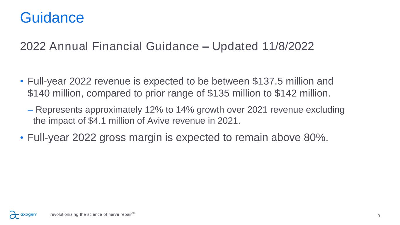 8 Delivering strong, consistent revenue growth & gross margins Operational Highlights • Q3 revenue growth of 18%.* • Procedure volumes improved as hospitals continued to address staffing challenges. • Total Core Accounts of 331 increased 11% sequentially, and 17% increase over an adjusted* prior year level of 283. • Total Active Accounts of 952 increased 1% sequentially, and 2% increase over an adjusted* prior year level of 930. 83.3% Gross Margin for the quarter ended September 30, 2022 U.S. $ in millions * Axogen voluntarily suspended market availability of Avive® Soft Tissue Membrane on June 1, 2021, and therefore there was no Avive revenue recorded in either the third quarter of 2021 or 2022. Avive revenue totaled approximately $4.1 million and $5.5 million for the years ended 2021 and 2020 respectively. $27.3 $41.1 $60.4 $83.9 $106.7 $112.3 $127.4 2015 2016 2017 2018 2019 2020 2021 Annual Revenue 29% CAGR revolutionizing the science of nerve repair™ $31.2 $37.0 Q3 2021 Q3 2022 Q3 Revenue 18% Increase over Q3 2021