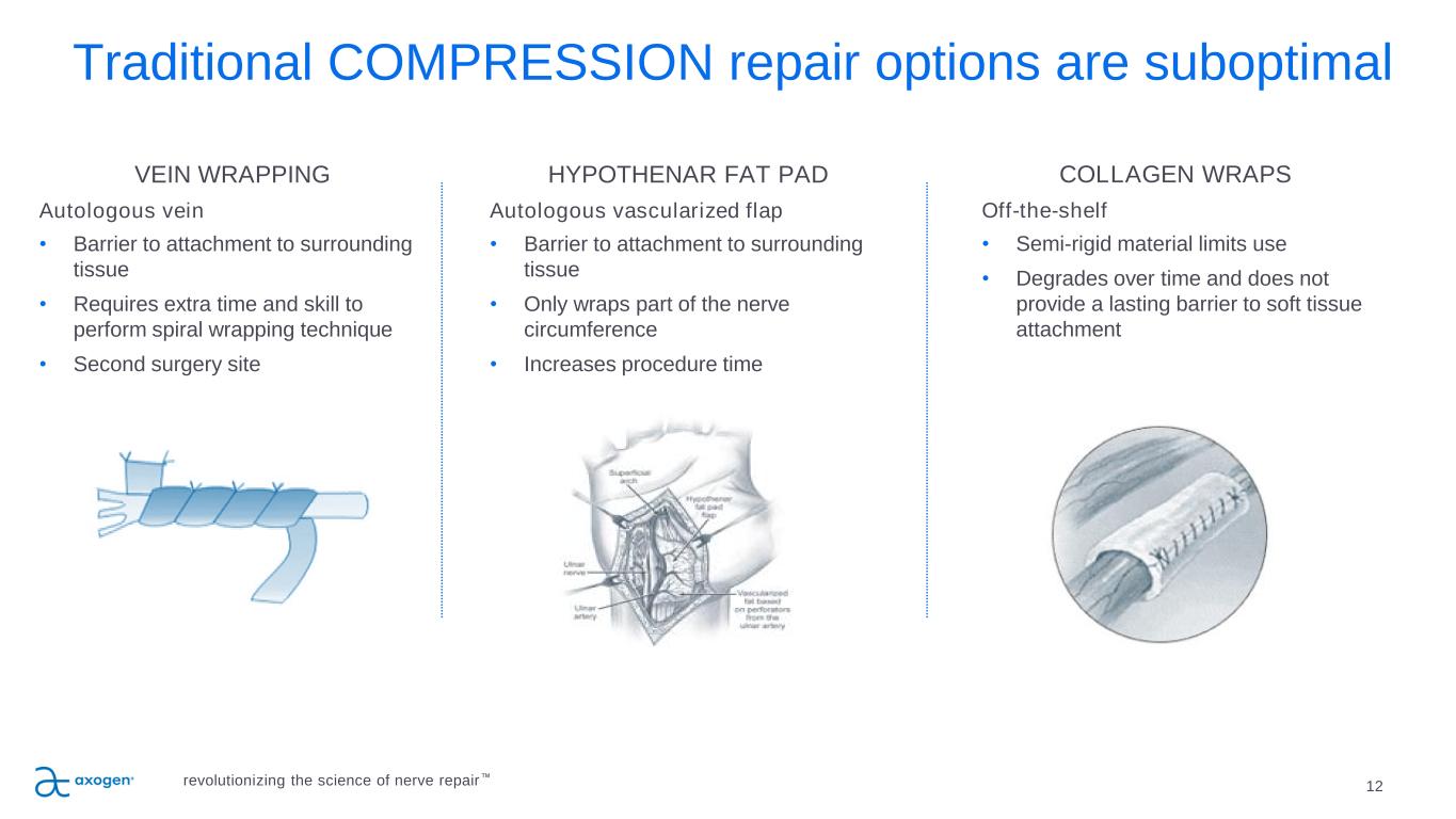 Traditional TRANSECTION repair options are suboptimal 10 SUTURE Direct suture repair of no-gap injuries • Common repair method • May result in tension to the repair leading to ischemia • Concentrates sutures at the coaptation site AUTOGRAFT Traditional method despite several disadvantages • Secondary surgery • Loss of function and sensation at harvest site • 27% complication rate including infection, wound healing and chronic pain 19 • Limited availability of graft length and diameter SYNTHETIC CONDUITS Convenient off the shelf option; limited efficacy & use • Provides only gross direction for regrowth • Limited to small gaps • 34%-57% failure rate >5mm gaps20, 21 • Semi-rigid and opaque material limits use and visualization • Repair reliant on fibrin clot formation revolutionizing the science of nerve repair™