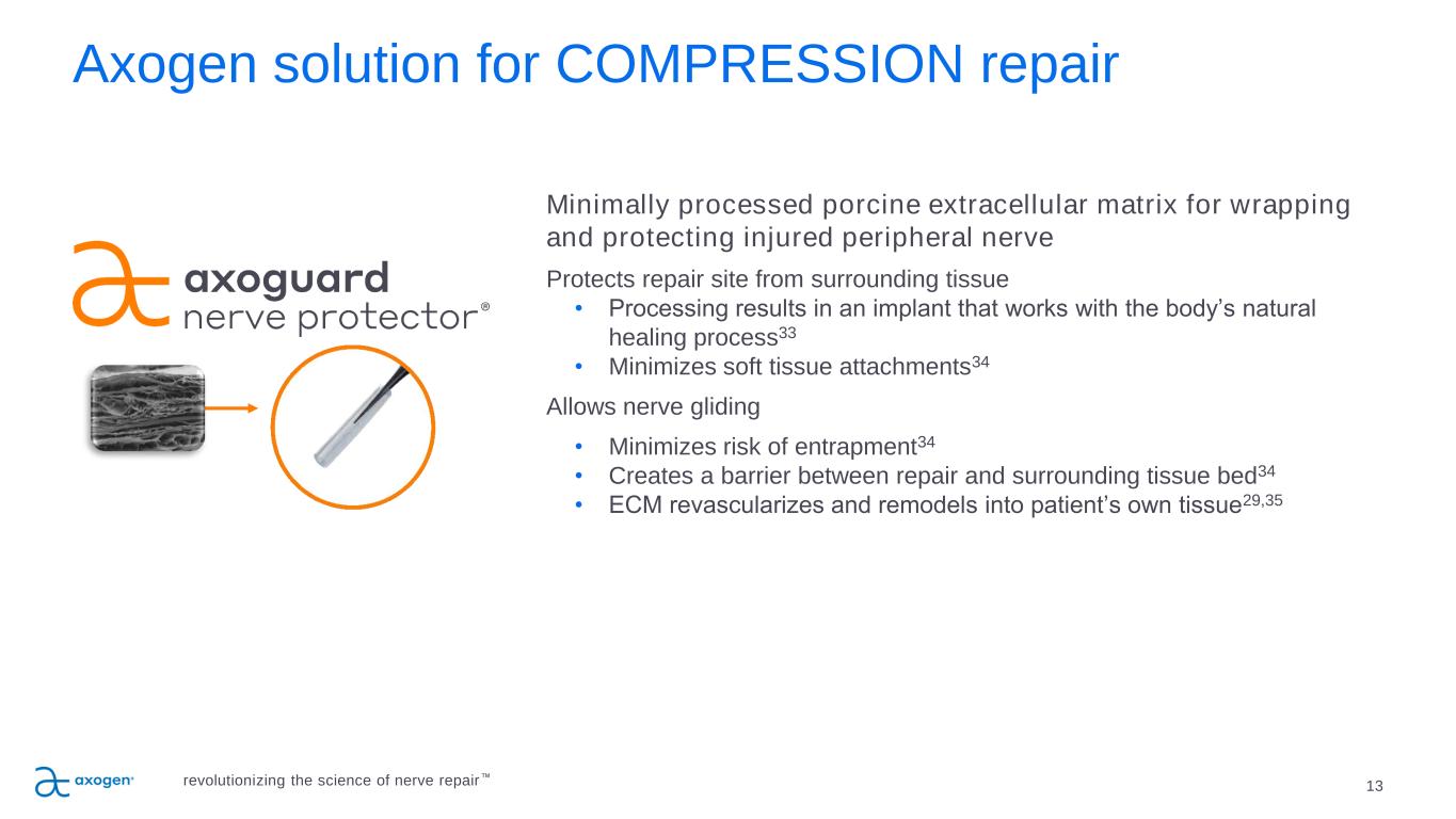Traditional COMPRESSION repair options are suboptimal 12 VEIN WRAPPING Autologous vein • Barrier to attachment to surrounding tissue • Requires extra time and skill to perform spiral wrapping technique • Second surgery site HYPOTHENAR FAT PAD Autologous vascularized flap • Barrier to attachment to surrounding tissue • Only wraps part of the nerve circumference • Increases procedure time COLLAGEN WRAPS Off-the-shelf • Semi-rigid material limits use • Degrades over time and does not provide a lasting barrier to soft tissue attachment revolutionizing the science of nerve repair™