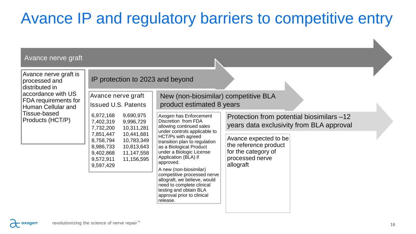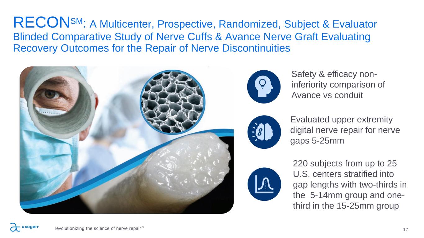 16 Avance IP and regulatory barriers to competitive entry Avance nerve graft is processed and distributed in accordance with US FDA requirements for Human Cellular and Tissue-based Products (HCT/P) Avance nerve graft Issued U.S. Patents Axogen has Enforcement Discretion from FDA allowing continued sales under controls applicable to HCT/Ps with agreed transition plan to regulation as a Biological Product under a Biologic License Application (BLA) if approved. A new (non-biosimilar) competitive processed nerve allograft, we believe, would need to complete clinical testing and obtain BLA approval prior to clinical release. Avance expected to be the reference product for the category of processed nerve allograft Avance nerve graft IP protection to 2023 and beyond New (non-biosimilar) competitive BLA product estimated 8 years Protection from potential biosimilars –12 years data exclusivity from BLA approval revolutionizing the science of nerve repair™ 6,972,168 9,690,975 7,402,319 9,996,729 7,732,200 10,311,281 7,851,447 10,441,681 8,758,794 10,783,349 8,986,733 10,813,643 9,402,868 11,147,558 9,572,911 11,156,595 9,597,429