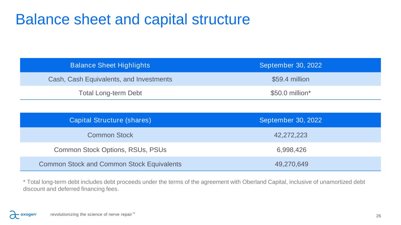26 Balance Sheet Highlights September 30, 2022 Cash, Cash Equivalents, and Investments $59.4 million Total Long-term Debt $50.0 million* Capital Structure (shares) September 30, 2022 Common Stock 42,272,223 Common Stock Options, RSUs, PSUs 6,998,426 Common Stock and Common Stock Equivalents 49,270,649 Balance sheet and capital structure * Total long-term debt includes debt proceeds under the terms of the agreement with Oberland Capital, inclusive of unamortized debt discount and deferred financing fees. revolutionizing the science of nerve repair™