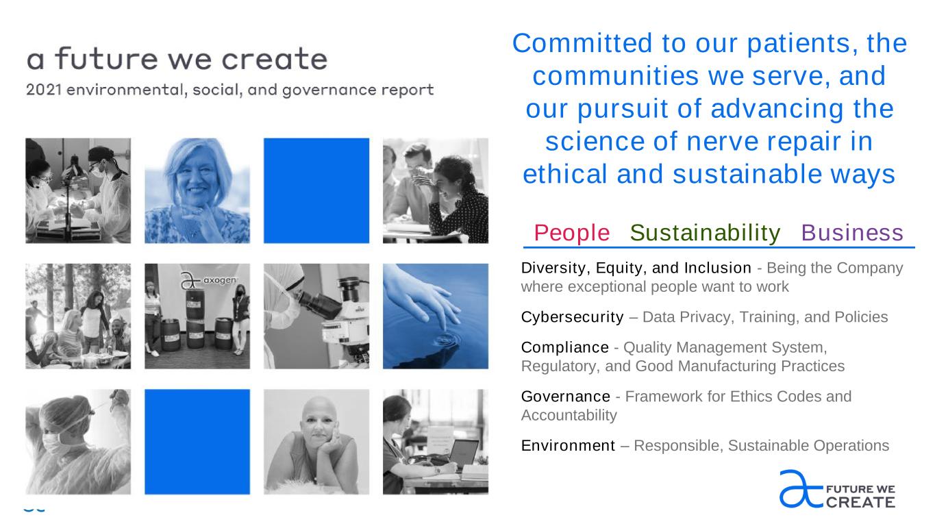 Committed to our patients, the communities we serve, and our pursuit of advancing the science of nerve repair in ethical and sustainable ways Diversity, Equity, and Inclusion - Being the Company where exceptional people want to work Cybersecurity – Data Privacy, Training, and Policies Compliance - Quality Management System, Regulatory, and Good Manufacturing Practices Governance - Framework for Ethics Codes and Accountability Environment – Responsible, Sustainable Operations People Sustainability Business