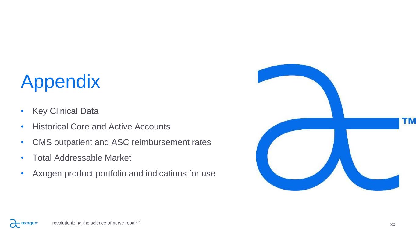 Axogen is the preeminent nerve repair company with a foundation for long-term sustainable growth 29 • Exclusively focused on peripheral nerve repair with a differentiated platform • 10+ years of demonstrated clinical outcome consistency • Featured in 207 peer-reviewed clinical publications • Over 50,000 Avance® Nerve Grafts implanted • Significant barriers to competitive entry • FDA granted Avance Regenerative Medicine Advanced Therapy (RMAT) designation • Commercial and surgeon education capabilities • Solid balance sheet provides resources to execute business plan • Experienced management team with strong track record of success revolutionizing the science of nerve repair™