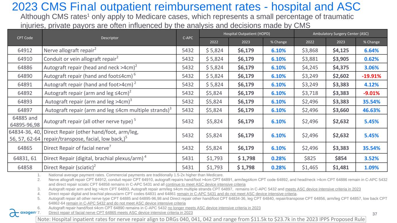 CPT Code Descriptor C-APC Hospital Outpatient (HOPD) Ambulatory Surgery Center (ASC) 2022 2023 % Change 2022 2023 % Change 64912 Nerve allograft repair2 5432 $ 5,824 $6,179 6.10% $3,868 $4,125 6.64% 64910 Conduit or vein allograft repair2 5432 $ 5,824 $6,179 6.10% $3,881 $3,905 0.62% 64886 Autograft repair (head and neck >4cm)2 5432 $ 5,824 $6,179 6.10% $4,245 $4,375 3.06% 64890 Autograft repair (hand and foot≤4cm) 6 5432 $ 5,824 $6,179 6.10% $3,249 $2,602 -19.91% 64891 Autograft repair (hand and foot>4cm) 2 5432 $ 5,824 $6,179 6.10% $3,249 $3,383 4.12% 64892 Autograft repair (arm and leg ≤4cm)2 5432 $5,824 $6,179 6.10% $3,718 $3,383 -9.01% 64893 Autograft repair (arm and leg >4cm)3 5432 $5,824 $6,179 6.10% $2,496 $3,383 35.54% 64897 Autograft repair (arm and leg ≤4cm multiple strands)3 5432 $5,824 $6,179 6.10% $2,496 $3,660 46.63% 64885 and 64895-96,98 Autograft repair (all other nerve type) 5 5432 $5,824 $6,179 6.10% $2,496 $2,632 5.45% 64834-36, 40, 56, 57, 62-64 Direct Repair (other hand/foot, arm/leg, repair/transpose, facial, low back,)5 5432 $5,824 $6,179 6.10% $2,496 $2,632 5.45% 64865 Direct Repair of facial nerve7 5432 $5,824 $6,179 6.10% $2,496 $3,383 35.54% 64831, 61 Direct Repair (digital, brachial plexus/arm) 4 5431 $1,793 $ 1,798 0.28% $825 $854 3.52% 64858 Direct Repair (sciatic)2 5431 $1,793 $ 1,798 0.28% $1,465 $1,481 1.09% 2023 CMS Final outpatient reimbursement rates - hospital and ASC 37 Although CMS rates1 only apply to Medicare cases, which represents a small percentage of traumatic injuries, private payors are often influenced by the analysis and decisions made by CMS 1. National average payment rates. Commercial payments are traditionally 1.5-2x higher than Medicare. 2. Nerve allograft repair CPT 64912, conduit repair CPT 64910, autograft repairs hand/foot >4cm CPT 64891, arm/leg≤4cm CPT code 64892, and head/neck >4cm CPT 64886 remain in C-APC 5432 and direct repair sciatic CPT 64858 remains in C-APC 5431 and all continue to meet ASC device intensive criteria 3. Autograft repair arm and leg >4cm CPT 64893, Autograft repair arm/leg ≤4cm multiple strands CPT 64897, remains in C-APC 5432 and meets ASC device intensive criteria in 2023 4. Direct repair digital and brachial plexus/arm CPT codes 64831 and 64861 remain in C-APC 5431 and do not meet ASC device intensive criteria. 5. Autograft repair all other nerve type CPT 64885 and 64895-96,98 and Direct repair other hand/foot CPT 64834-36, leg CPT 64840, repair/transpose CPT 64856, arm/leg CPT 64857, low back CPT 64862-64 remain in C-APC 5432 and do not meet ASC device intensive criteria 6. Autograft repair hand/foot ≤4cm CPT 64890 remains in C-APC 5432 no longer meets ASC device intensive criteria in 2023 7. Direct repair of facial nerve CPT 64865 meets ASC device intensive criteria in 2023 Note: Hospital inpatient rates for nerve repair align to DRGs 040, 041, 042 and range from $11.5k to $23.7k in the 2023 IPPS Proposed Rule