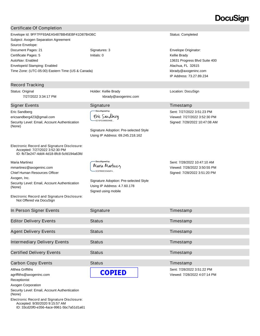 Certificate Of Completion Envelope Id: 9FF7FF93AEA5487BB45EBF41D87B436C Status: Completed Subject: Axogen Separation Agreement Source Envelope: Document Pages: 21 Signatures: 3 Envelope Originator: Certificate Pages: 5 Initials: 0 Kellie Brady AutoNav: Enabled EnvelopeId Stamping: Enabled Time Zone: (UTC-05:00) Eastern Time (US & Canada) 13631 Progress Blvd Suite 400 Alachua, FL 32615 kbrady@axogeninc.com IP Address: 73.27.89.234 Record Tracking Status: Original 7/27/2022 3:34:17 PM Holder: Kellie Brady kbrady@axogeninc.com Location: DocuSign Signer Events Signature Timestamp Eric Sandberg ericsandberg423@gmail.com Security Level: Email, Account Authentication (None) Signature Adoption: Pre-selected Style Using IP Address: 69.245.218.162 Sent: 7/27/2022 3:51:23 PM Viewed: 7/27/2022 3:52:30 PM Signed: 7/28/2022 10:47:08 AM Electronic Record and Signature Disclosure: Accepted: 7/27/2022 3:52:30 PM ID: fb73e247-4dd4-4d18-8fc8-5cfd194a63fd Maria Martinez mmartinez@axogeninc.com Chief Human Resources Officer Axogen, Inc. Security Level: Email, Account Authentication (None) Signature Adoption: Pre-selected Style Using IP Address: 4.7.60.178 Signed using mobile Sent: 7/28/2022 10:47:10 AM Viewed: 7/28/2022 3:50:55 PM Signed: 7/28/2022 3:51:20 PM Electronic Record and Signature Disclosure: Not Offered via DocuSign In Person Signer Events Signature Timestamp Editor Delivery Events Status Timestamp Agent Delivery Events Status Timestamp Intermediary Delivery Events Status Timestamp Certified Delivery Events Status Timestamp Carbon Copy Events Status Timestamp Althea Griffiths agriffiths@axogeninc.com Receptionist Axogen Corporation Security Level: Email, Account Authentication (None) Sent: 7/28/2022 3:51:22 PM Viewed: 7/28/2022 4:07:14 PM Electronic Record and Signature Disclosure: Accepted: 9/30/2020 9:15:57 AM ID: 33cd20f0-e356-4ace-9961-5bc7a51d1a61