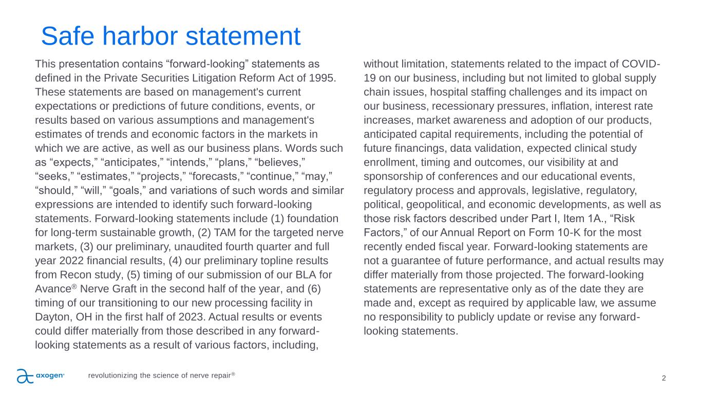 2 This presentation contains “forward-looking” statements as defined in the Private Securities Litigation Reform Act of 1995. These statements are based on management's current expectations or predictions of future conditions, events, or results based on various assumptions and management's estimates of trends and economic factors in the markets in which we are active, as well as our business plans. Words such as “expects,” “anticipates,” “intends,” “plans,” “believes,” “seeks,” “estimates,” “projects,” “forecasts,” “continue,” “may,” “should,” “will,” “goals,” and variations of such words and similar expressions are intended to identify such forward-looking statements. Forward-looking statements include (1) foundation for long-term sustainable growth, (2) TAM for the targeted nerve markets, (3) our preliminary, unaudited fourth quarter and full year 2022 financial results, (4) our preliminary topline results from Recon study, (5) timing of our submission of our BLA for Avance® Nerve Graft in the second half of the year, and (6) timing of our transitioning to our new processing facility in Dayton, OH in the first half of 2023. Actual results or events could differ materially from those described in any forward- looking statements as a result of various factors, including, without limitation, statements related to the impact of COVID- 19 on our business, including but not limited to global supply chain issues, hospital staffing challenges and its impact on our business, recessionary pressures, inflation, interest rate increases, market awareness and adoption of our products, anticipated capital requirements, including the potential of future financings, data validation, expected clinical study enrollment, timing and outcomes, our visibility at and sponsorship of conferences and our educational events, regulatory process and approvals, legislative, regulatory, political, geopolitical, and economic developments, as well as those risk factors described under Part I, Item 1A., “Risk Factors,” of our Annual Report on Form 10-K for the most recently ended fiscal year. Forward-looking statements are not a guarantee of future performance, and actual results may differ materially from those projected. The forward-looking statements are representative only as of the date they are made and, except as required by applicable law, we assume no responsibility to publicly update or revise any forward- looking statements. Safe harbor statement revolutionizing the science of nerve repair®