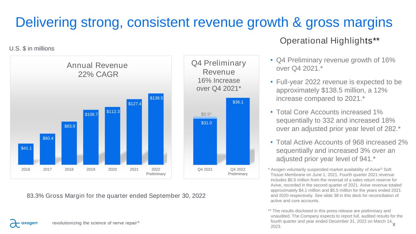 Targeted nerve markets (U.S.) 7 Trauma $1.9B Breast $250M OMF $300M Carpal & Cubital Tunnel $270M U.S. potential procedural estimates >900,000** • Trauma: > 700,000 • Carpal Tunnel Revisions & Cubital Tunnel: 130,000 • Oral Maxillofacial (OMF): 56,000 • Breast Neurotization Procedures: 15,000 *$2.7B estimate does not include pain market **Referenced papers were used to derive specific assumptions in the procedure potential estimates. Papers used include both U.S. and OUS databases and studies. See Appendix for data sources. >$2.7 Billion* revolutionizing the science of nerve repair®