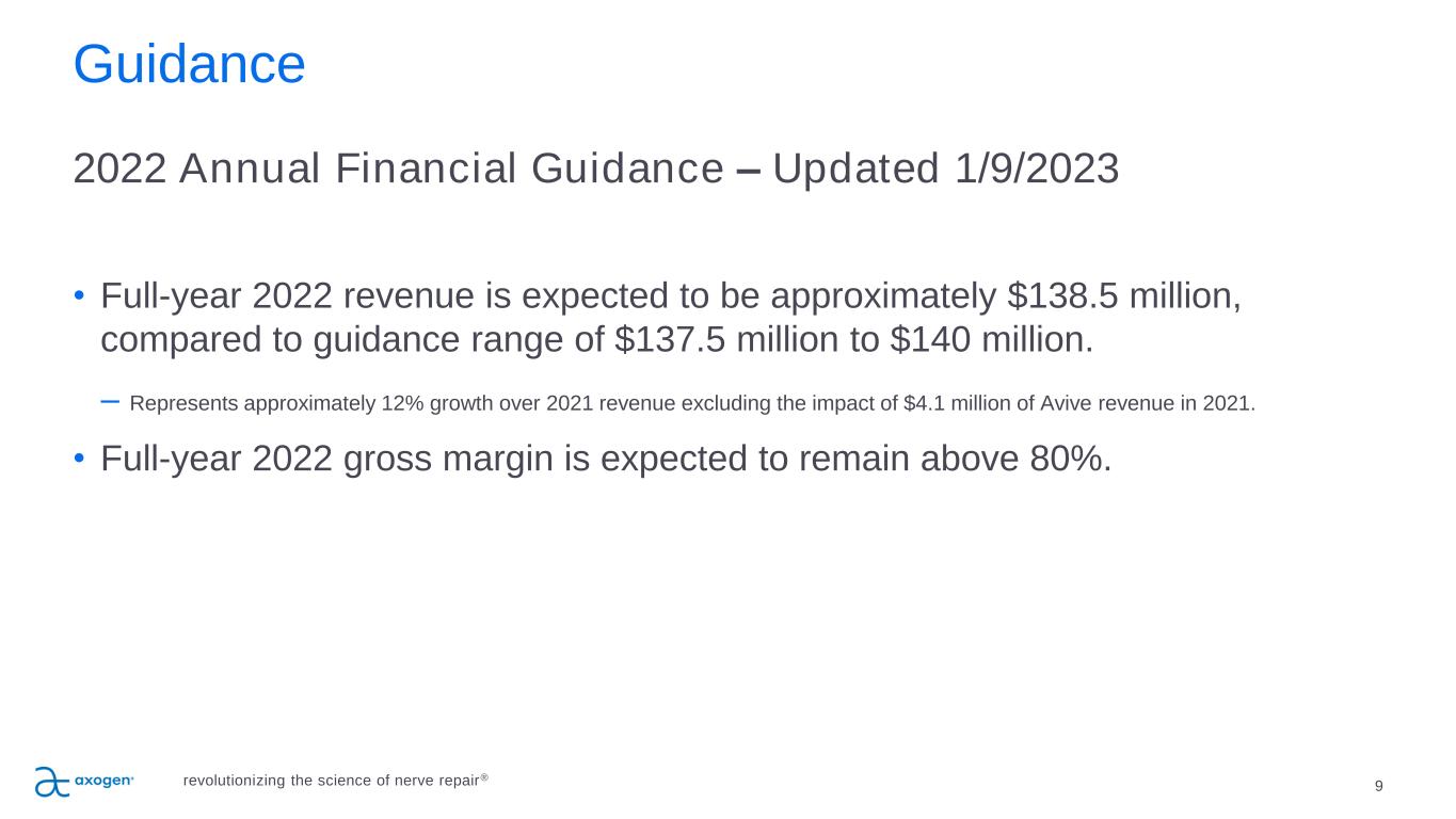 8 Delivering strong, consistent revenue growth & gross margins Operational Highlights** • Q4 Preliminary revenue growth of 16% over Q4 2021.* • Full-year 2022 revenue is expected to be approximately $138.5 million, a 12% increase compared to 2021.* • Total Core Accounts increased 1% sequentially to 332 and increased 18% over an adjusted prior year level of 282.* • Total Active Accounts of 968 increased 2% sequentially and increased 3% over an adjusted prior year level of 941.* 83.3% Gross Margin for the quarter ended September 30, 2022 U.S. $ in millions * Axogen voluntarily suspended market availability of Avive® Soft Tissue Membrane on June 1, 2021. Fourth quarter 2021 revenue includes $0.5 million from the reversal of a sales return reserve for Avive, recorded in the second quarter of 2021. Avive revenue totaled approximately $4.1 million and $5.5 million for the years ended 2021 and 2020 respectively. See slide 38 in this deck for reconciliation of active and core accounts. revolutionizing the science of nerve repair® $41.1 $60.4 $83.9 $106.7 $112.3 $127.4 $138.5 2016 2017 2018 2019 2020 2021 2022 Preliminary Annual Revenue 22% CAGR $31.0 $36.1 Q4 2021 Q4 2022 Preliminary Q4 Preliminary Revenue 16% Increase over Q4 2021* $0.5* ** The results disclosed in this press release are preliminary and unaudited. The Company expects to report full, audited results for the fourth quarter and year ended December 31, 2022 on March 14, 2023.