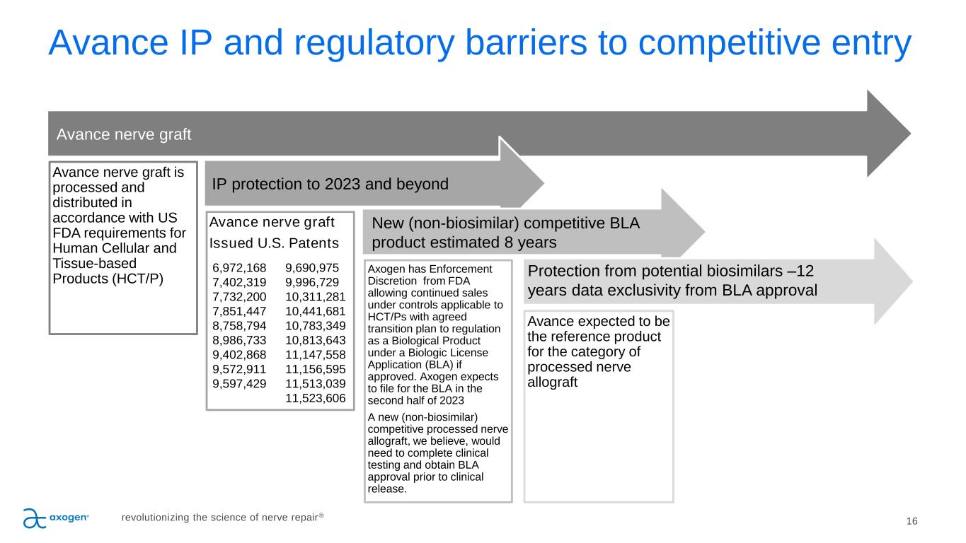 16 Avance IP and regulatory barriers to competitive entry Avance nerve graft is processed and distributed in accordance with US FDA requirements for Human Cellular and Tissue-based Products (HCT/P) Avance nerve graft Issued U.S. Patents Axogen has Enforcement Discretion from FDA allowing continued sales under controls applicable to HCT/Ps with agreed transition plan to regulation as a Biological Product under a Biologic License Application (BLA) if approved. Axogen expects to file for the BLA in the second half of 2023 A new (non-biosimilar) competitive processed nerve allograft, we believe, would need to complete clinical testing and obtain BLA approval prior to clinical release. Avance expected to be the reference product for the category of processed nerve allograft Avance nerve graft IP protection to 2023 and beyond New (non-biosimilar) competitive BLA product estimated 8 years Protection from potential biosimilars –12 years data exclusivity from BLA approval 6,972,168 9,690,975 7,402,319 9,996,729 7,732,200 10,311,281 7,851,447 10,441,681 8,758,794 10,783,349 8,986,733 10,813,643 9,402,868 11,147,558 9,572,911 11,156,595 9,597,429 11,513,039 11,523,606 revolutionizing the science of nerve repair®
