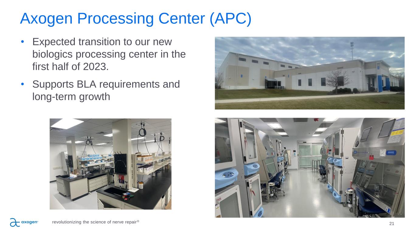 21 Axogen Processing Center (APC) • Expected transition to our new biologics processing center in the first half of 2023. • Supports BLA requirements and long-term growth revolutionizing the science of nerve repair®
