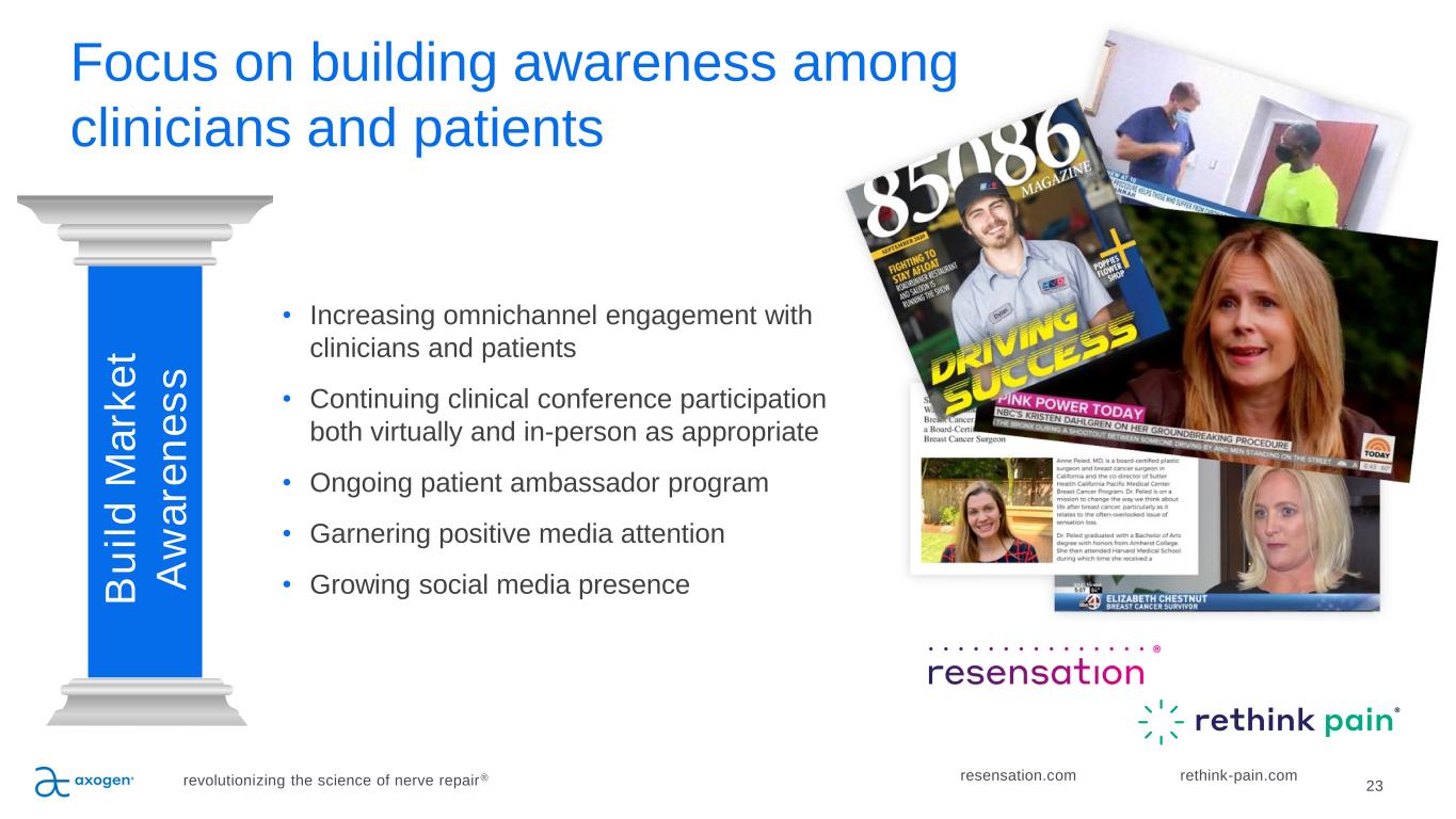 22 Market development strategy B u il d M a rk e t A w a re n e s s E d u c a te S u rg e o n s , D e v e lo p A d v o c a te s G ro w B o d y o f C li n ic a l E v id e n c e E x e c u te S a le s P la n E x p a n d P ro d u c t P ip e li n e + A p p li c a ti o n s revolutionizing the science of nerve repair®