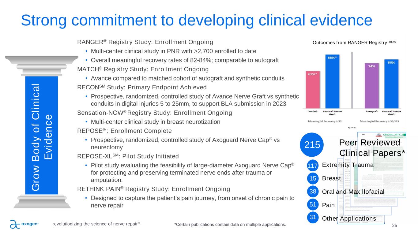 24 P IL L A R 2 Emphasis on education • In-person and virtual national education programs • Customized multimodal learning programs to specific surgeon groups for advanced learning • Ongoing interactive webinar series covering the principles of nerve repair • Train more than three-quarters of all hand and micro-surgery fellows annuallyE d u c a te S u rg e o n s , D e v e lo p A d v o c a te s revolutionizing the science of nerve repair®