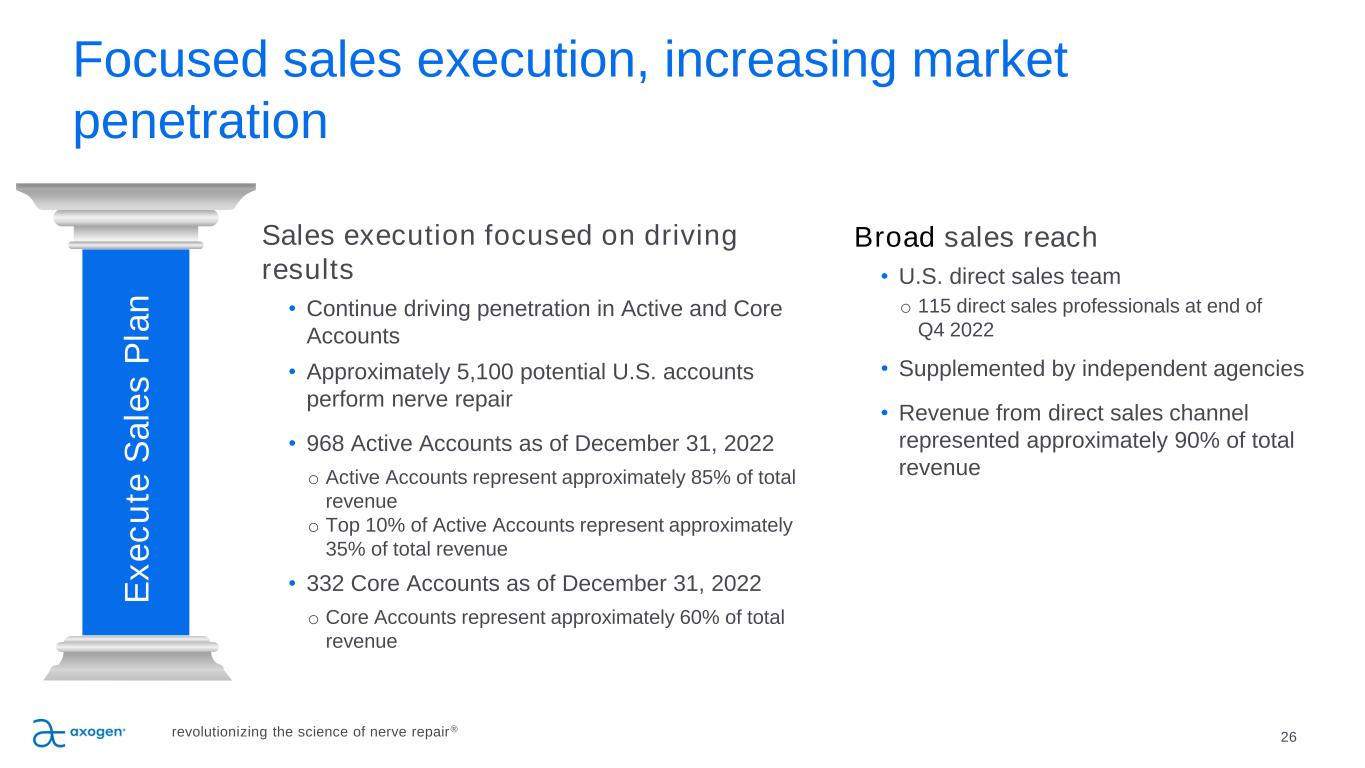 Outcomes from RANGER Registry 48,49 25 P IL L A R 3 Strong commitment to developing clinical evidence RANGER® Registry Study: Enrollment Ongoing • Multi-center clinical study in PNR with >2,700 enrolled to date • Overall meaningful recovery rates of 82-84%; comparable to autograft MATCH® Registry Study: Enrollment Ongoing • Avance compared to matched cohort of autograft and synthetic conduits RECONSM Study: Primary Endpoint Achieved • Prospective, randomized, controlled study of Avance Nerve Graft vs synthetic conduits in digital injuries 5 to 25mm, to support BLA submission in 2023 Sensation-NOW® Registry Study: Enrollment Ongoing • Multi-center clinical study in breast neurotization REPOSE® : Enrollment Complete • Prospective, randomized, controlled study of Axoguard Nerve Cap® vs neurectomy REPOSE-XLSM: Pilot Study Initiated • Pilot study evaluating the feasibility of large-diameter Axoguard Nerve Cap® for protecting and preserving terminated nerve ends after trauma or amputation. RETHINK PAIN® Registry Study: Enrollment Ongoing • Designed to capture the patient’s pain journey, from onset of chronic pain to nerve repair G ro w B o d y o f C li n ic a l E v id e n c e Peer Reviewed Clinical Papers* Extremity Trauma Breast Oral and Maxillofacial Pain Other Applications 117 15 38 51 31 215 *Certain publications contain data on multiple applications.revolutionizing the science of nerve repair®
