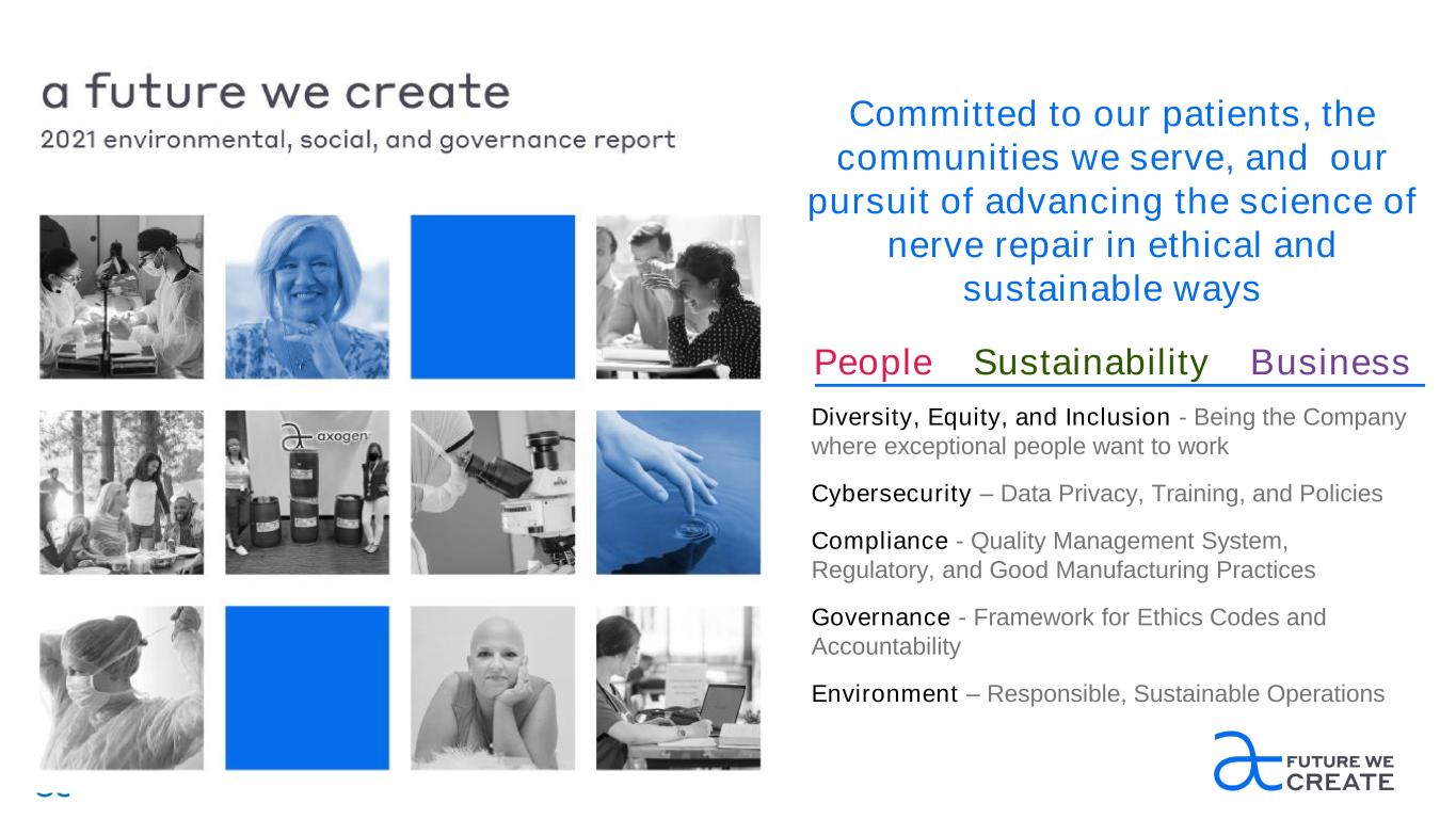 Committed to our patients, the communities we serve, and our pursuit of advancing the science of nerve repair in ethical and sustainable ways Diversity, Equity, and Inclusion - Being the Company where exceptional people want to work Cybersecurity – Data Privacy, Training, and Policies Compliance - Quality Management System, Regulatory, and Good Manufacturing Practices Governance - Framework for Ethics Codes and Accountability Environment – Responsible, Sustainable Operations People Sustainability Business