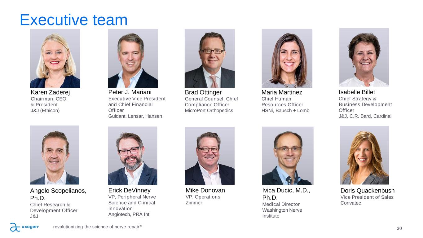 Executive team 30 Erick DeVinney VP, Peripheral Nerve Science and Clinical Innovation Angiotech, PRA Intl Mike Donovan VP, Operations Zimmer Ivica Ducic, M.D., Ph.D. Medical Director Washington Nerve Institute Angelo Scopelianos, Ph.D. Chief Research & Development Officer J&J Peter J. Mariani Executive Vice President and Chief Financial Officer Guidant, Lensar, Hansen Isabelle Billet Chief Strategy & Business Development Officer J&J, C.R. Bard, Cardinal Karen Zaderej Chairman, CEO, & President J&J (Ethicon) Maria Martinez Chief Human Resources Officer HSNi, Bausch + Lomb Brad Ottinger General Counsel, Chief Compliance Officer MicroPort Orthopedics Doris Quackenbush Vice President of Sales Convatec revolutionizing the science of nerve repair®