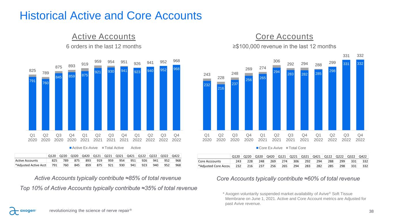 Historical Active and Core Accounts Active Accounts typically contribute ≈85% of total revenue Top 10% of Active Accounts typically contribute ≈35% of total revenue Active Accounts 6 orders in the last 12 months Core Accounts typically contribute ≈60% of total revenue Core Accounts ≥$100,000 revenue in the last 12 months 38revolutionizing the science of nerve repair® 791 760 845 859 875 921 930 941 923 940 952 968825 789 875 893 919 959 954 951 926 941 952 968 Q1 2020 Q2 2020 Q3 2020 Q4 2020 Q1 2021 Q2 2021 Q3 2021 Q4 2021 Q1 2022 Q2 2022 Q3 2022 Q4 2022 Active Ex-Avive Total Active Active 232 216 237 256 265 294 283 282 285 298 331 332 243 228 248 269 274 306 292 294 288 299 331 332 Q1 2020 Q2 2020 Q3 2020 Q4 2020 Q1 2021 Q2 2021 Q3 2021 Q4 2021 Q1 2022 Q2 2022 Q3 2022 Q4 2022 Core Ex-Avive Total Core Q120 Q220 Q320 Q420 Q121 Q221 Q321 Q421 Q122 Q222 Q322 Q422 Active Accounts 825 789 875 893 919 959 954 951 926 941 952 968 *Adjusted Active Acctounts791 760 845 859 875 921 930 941 923 940 952 968 Q120 Q220 Q320 Q420 Q121 Q221 Q321 Q421 Q122 Q222 Q322 Q422 Core Acccounts 243 228 248 269 274 306 292 294 288 299 331 332 *Adjusted Core Accounts 232 216 237 256 265 294 283 282 285 298 331 332 * Axogen voluntarily suspended market availability of Avive® Soft Tissue Membrane on June 1, 2021. Active and Core Account metrics are Adjusted for past Avive revenue.