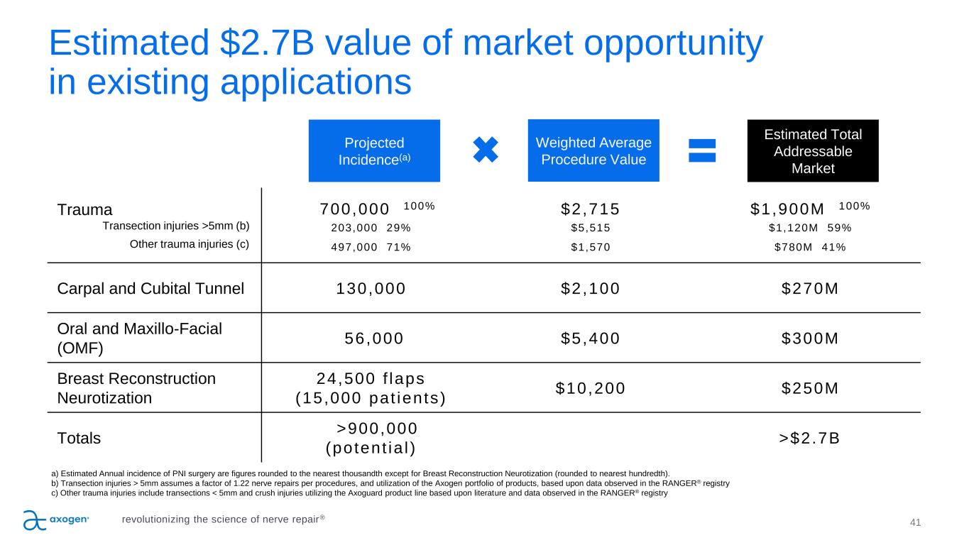 Projected Incidence(a) Weighted Average Procedure Value Estimated Total Addressable Market Trauma Transection injuries >5mm (b) Other trauma injuries (c) 700,000 100% 203,000 29% 497,000 71% $2,715 $5,515 $1,570 $1,900M 100% $1,120M 59% $780M 41% Carpal and Cubital Tunnel 130,000 $2,100 $270M Oral and Maxillo-Facial (OMF) 56,000 $5,400 $300M Breast Reconstruction Neurotization 24,500 f laps (15,000 pat ients) $10,200 $250M Totals >900,000 (potent ia l ) >$2.7B a) Estimated Annual incidence of PNI surgery are figures rounded to the nearest thousandth except for Breast Reconstruction Neurotization (rounded to nearest hundredth). b) Transection injuries > 5mm assumes a factor of 1.22 nerve repairs per procedures, and utilization of the Axogen portfolio of products, based upon data observed in the RANGER® registry c) Other trauma injuries include transections < 5mm and crush injuries utilizing the Axoguard product line based upon literature and data observed in the RANGER® registry 41 Estimated $2.7B value of market opportunity in existing applications revolutionizing the science of nerve repair®
