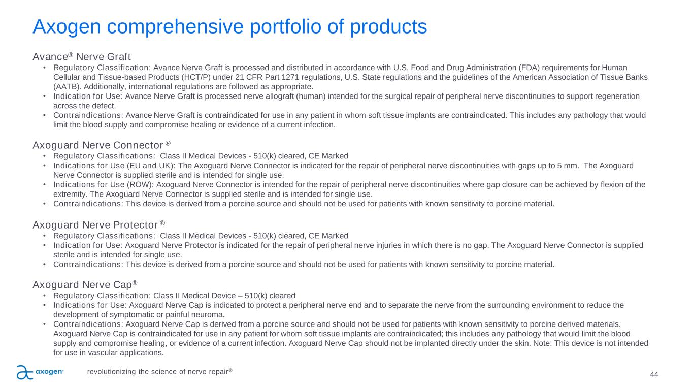 Axogen comprehensive portfolio of products Avance® Nerve Graft • Regulatory Classification: Avance Nerve Graft is processed and distributed in accordance with U.S. Food and Drug Administration (FDA) requirements for Human Cellular and Tissue-based Products (HCT/P) under 21 CFR Part 1271 regulations, U.S. State regulations and the guidelines of the American Association of Tissue Banks (AATB). Additionally, international regulations are followed as appropriate. • Indication for Use: Avance Nerve Graft is processed nerve allograft (human) intended for the surgical repair of peripheral nerve discontinuities to support regeneration across the defect. • Contraindications: Avance Nerve Graft is contraindicated for use in any patient in whom soft tissue implants are contraindicated. This includes any pathology that would limit the blood supply and compromise healing or evidence of a current infection. Axoguard Nerve Connector ® • Regulatory Classifications: Class II Medical Devices - 510(k) cleared, CE Marked • Indications for Use (EU and UK): The Axoguard Nerve Connector is indicated for the repair of peripheral nerve discontinuities with gaps up to 5 mm. The Axoguard Nerve Connector is supplied sterile and is intended for single use. • Indications for Use (ROW): Axoguard Nerve Connector is intended for the repair of peripheral nerve discontinuities where gap closure can be achieved by flexion of the extremity. The Axoguard Nerve Connector is supplied sterile and is intended for single use. • Contraindications: This device is derived from a porcine source and should not be used for patients with known sensitivity to porcine material. Axoguard Nerve Protector ® • Regulatory Classifications: Class II Medical Devices - 510(k) cleared, CE Marked • Indication for Use: Axoguard Nerve Protector is indicated for the repair of peripheral nerve injuries in which there is no gap. The Axoguard Nerve Connector is supplied sterile and is intended for single use. • Contraindications: This device is derived from a porcine source and should not be used for patients with known sensitivity to porcine material. Axoguard Nerve Cap® • Regulatory Classification: Class II Medical Device – 510(k) cleared • Indications for Use: Axoguard Nerve Cap is indicated to protect a peripheral nerve end and to separate the nerve from the surrounding environment to reduce the development of symptomatic or painful neuroma. • Contraindications: Axoguard Nerve Cap is derived from a porcine source and should not be used for patients with known sensitivity to porcine derived materials. Axoguard Nerve Cap is contraindicated for use in any patient for whom soft tissue implants are contraindicated; this includes any pathology that would limit the blood supply and compromise healing, or evidence of a current infection. Axoguard Nerve Cap should not be implanted directly under the skin. Note: This device is not intended for use in vascular applications. 44revolutionizing the science of nerve repair®