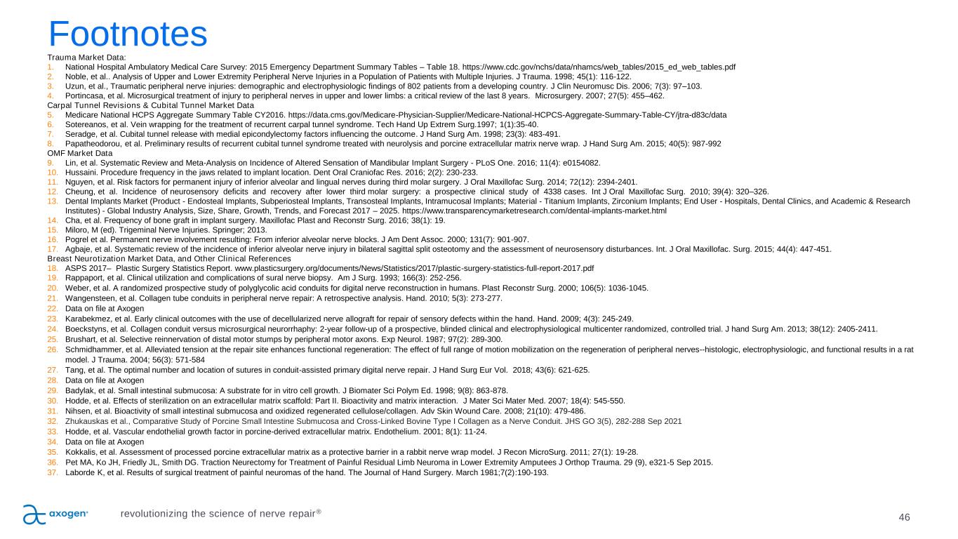 46 Footnotes Trauma Market Data: 1. National Hospital Ambulatory Medical Care Survey: 2015 Emergency Department Summary Tables – Table 18. https://www.cdc.gov/nchs/data/nhamcs/web_tables/2015_ed_web_tables.pdf 2. Noble, et al.. Analysis of Upper and Lower Extremity Peripheral Nerve Injuries in a Population of Patients with Multiple Injuries. J Trauma. 1998; 45(1): 116-122. 3. Uzun, et al., Traumatic peripheral nerve injuries: demographic and electrophysiologic findings of 802 patients from a developing country. J Clin Neuromusc Dis. 2006; 7(3): 97–103. 4. Portincasa, et al. Microsurgical treatment of injury to peripheral nerves in upper and lower limbs: a critical review of the last 8 years. Microsurgery. 2007; 27(5): 455–462. Carpal Tunnel Revisions & Cubital Tunnel Market Data 5. Medicare National HCPS Aggregate Summary Table CY2016. https://data.cms.gov/Medicare-Physician-Supplier/Medicare-National-HCPCS-Aggregate-Summary-Table-CY/jtra-d83c/data 6. Sotereanos, et al. Vein wrapping for the treatment of recurrent carpal tunnel syndrome. Tech Hand Up Extrem Surg.1997; 1(1):35-40. 7. Seradge, et al. Cubital tunnel release with medial epicondylectomy factors influencing the outcome. J Hand Surg Am. 1998; 23(3): 483-491. 8. Papatheodorou, et al. Preliminary results of recurrent cubital tunnel syndrome treated with neurolysis and porcine extracellular matrix nerve wrap. J Hand Surg Am. 2015; 40(5): 987-992 OMF Market Data 9. Lin, et al. Systematic Review and Meta-Analysis on Incidence of Altered Sensation of Mandibular Implant Surgery - PLoS One. 2016; 11(4): e0154082. 10. Hussaini. Procedure frequency in the jaws related to implant location. Dent Oral Craniofac Res. 2016; 2(2): 230-233. 11. Nguyen, et al. Risk factors for permanent injury of inferior alveolar and lingual nerves during third molar surgery. J Oral Maxillofac Surg. 2014; 72(12): 2394-2401. 12. Cheung, et al. Incidence of neurosensory deficits and recovery after lower third molar surgery: a prospective clinical study of 4338 cases. Int J Oral Maxillofac Surg. 2010; 39(4): 320–326. 13. Dental Implants Market (Product - Endosteal Implants, Subperiosteal Implants, Transosteal Implants, Intramucosal Implants; Material - Titanium Implants, Zirconium Implants; End User - Hospitals, Dental Clinics, and Academic & Research Institutes) - Global Industry Analysis, Size, Share, Growth, Trends, and Forecast 2017 – 2025. https://www.transparencymarketresearch.com/dental-implants-market.html 14. Cha, et al. Frequency of bone graft in implant surgery. Maxillofac Plast and Reconstr Surg. 2016; 38(1): 19. 15. Miloro, M (ed). Trigeminal Nerve Injuries. Springer; 2013. 16. Pogrel et al. Permanent nerve involvement resulting: From inferior alveolar nerve blocks. J Am Dent Assoc. 2000; 131(7): 901-907. 17. Agbaje, et al. Systematic review of the incidence of inferior alveolar nerve injury in bilateral sagittal split osteotomy and the assessment of neurosensory disturbances. Int. J Oral Maxillofac. Surg. 2015; 44(4): 447-451. Breast Neurotization Market Data, and Other Clinical References 18. ASPS 2017– Plastic Surgery Statistics Report. www.plasticsurgery.org/documents/News/Statistics/2017/plastic-surgery-statistics-full-report-2017.pdf 19. Rappaport, et al. Clinical utilization and complications of sural nerve biopsy. Am J Surg. 1993; 166(3): 252-256. 20. Weber, et al. A randomized prospective study of polyglycolic acid conduits for digital nerve reconstruction in humans. Plast Reconstr Surg. 2000; 106(5): 1036-1045. 21. Wangensteen, et al. Collagen tube conduits in peripheral nerve repair: A retrospective analysis. Hand. 2010; 5(3): 273-277. 22. Data on file at Axogen 23. Karabekmez, et al. Early clinical outcomes with the use of decellularized nerve allograft for repair of sensory defects within the hand. Hand. 2009; 4(3): 245-249. 24. Boeckstyns, et al. Collagen conduit versus microsurgical neurorrhaphy: 2-year follow-up of a prospective, blinded clinical and electrophysiological multicenter randomized, controlled trial. J hand Surg Am. 2013; 38(12): 2405-2411. 25. Brushart, et al. Selective reinnervation of distal motor stumps by peripheral motor axons. Exp Neurol. 1987; 97(2): 289-300. 26. Schmidhammer, et al. Alleviated tension at the repair site enhances functional regeneration: The effect of full range of motion mobilization on the regeneration of peripheral nerves--histologic, electrophysiologic, and functional results in a rat model. J Trauma. 2004; 56(3): 571-584 27. Tang, et al. The optimal number and location of sutures in conduit-assisted primary digital nerve repair. J Hand Surg Eur Vol. 2018; 43(6): 621-625. 28. Data on file at Axogen 29. Badylak, et al. Small intestinal submucosa: A substrate for in vitro cell growth. J Biomater Sci Polym Ed. 1998; 9(8): 863-878. 30. Hodde, et al. Effects of sterilization on an extracellular matrix scaffold: Part II. Bioactivity and matrix interaction. J Mater Sci Mater Med. 2007; 18(4): 545-550. 31. Nihsen, et al. Bioactivity of small intestinal submucosa and oxidized regenerated cellulose/collagen. Adv Skin Wound Care. 2008; 21(10): 479-486. 32. Zhukauskas et al., Comparative Study of Porcine Small Intestine Submucosa and Cross-Linked Bovine Type I Collagen as a Nerve Conduit. JHS GO 3(5), 282-288 Sep 2021 33. Hodde, et al. Vascular endothelial growth factor in porcine-derived extracellular matrix. Endothelium. 2001; 8(1): 11-24. 34. Data on file at Axogen 35. Kokkalis, et al. Assessment of processed porcine extracellular matrix as a protective barrier in a rabbit nerve wrap model. J Recon MicroSurg. 2011; 27(1): 19-28. 36. Pet MA, Ko JH, Friedly JL, Smith DG. Traction Neurectomy for Treatment of Painful Residual Limb Neuroma in Lower Extremity Amputees J Orthop Trauma. 29 (9), e321-5 Sep 2015. 37. Laborde K, et al. Results of surgical treatment of painful neuromas of the hand. The Journal of Hand Surgery. March 1981;7(2):190-193. revolutionizing the science of nerve repair®