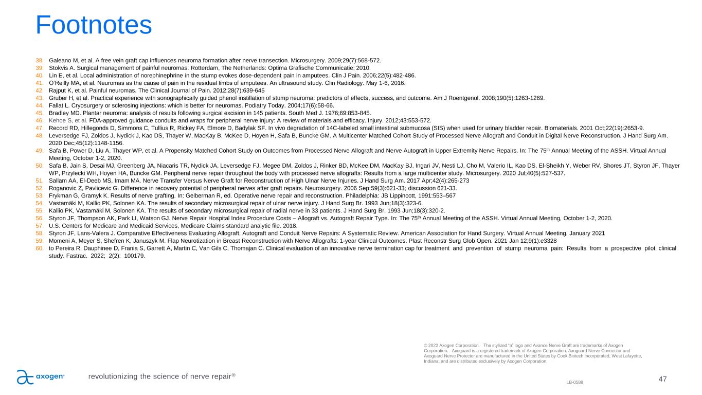 47 Footnotes 38. Galeano M, et al. A free vein graft cap influences neuroma formation after nerve transection. Microsurgery. 2009;29(7):568-572. 39. Stokvis A. Surgical management of painful neuromas. Rotterdam, The Netherlands: Optima Grafische Communicatie; 2010. 40. Lin E, et al. Local administration of norephinephrine in the stump evokes dose-dependent pain in amputees. Clin J Pain. 2006;22(5):482-486. 41. O’Reilly MA, et al. Neuromas as the cause of pain in the residual limbs of amputees. An ultrasound study. Clin Radiology. May 1-6, 2016. 42. Rajput K, et al. Painful neuromas. The Clinical Journal of Pain. 2012;28(7):639-645 43. Gruber H, et al. Practical experience with sonographically guided phenol instillation of stump neuroma: predictors of effects, success, and outcome. Am J Roentgenol. 2008;190(5):1263-1269. 44. Fallat L. Cryosurgery or sclerosing injections: which is better for neuromas. Podiatry Today. 2004;17(6):58-66. 45. Bradley MD. Plantar neuroma: analysis of results following surgical excision in 145 patients. South Med J. 1976;69:853-845. 46. Kehoe S, et al. FDA-approved guidance conduits and wraps for peripheral nerve injury: A review of materials and efficacy. Injury. 2012;43:553-572. 47. Record RD, Hillegonds D, Simmons C, Tullius R, Rickey FA, Elmore D, Badylak SF. In vivo degradation of 14C-labeled small intestinal submucosa (SIS) when used for urinary bladder repair. Biomaterials. 2001 Oct;22(19):2653-9. 48. Leversedge FJ, Zoldos J, Nydick J, Kao DS, Thayer W, MacKay B, McKee D, Hoyen H, Safa B, Buncke GM. A Multicenter Matched Cohort Study of Processed Nerve Allograft and Conduit in Digital Nerve Reconstruction. J Hand Surg Am. 2020 Dec;45(12):1148-1156. 49. Safa B, Power D, Liu A, Thayer WP, et al. A Propensity Matched Cohort Study on Outcomes from Processed Nerve Allograft and Nerve Autograft in Upper Extremity Nerve Repairs. In: The 75th Annual Meeting of the ASSH. Virtual Annual Meeting, October 1-2, 2020. 50. Safa B, Jain S, Desai MJ, Greenberg JA, Niacaris TR, Nydick JA, Leversedge FJ, Megee DM, Zoldos J, Rinker BD, McKee DM, MacKay BJ, Ingari JV, Nesti LJ, Cho M, Valerio IL, Kao DS, El-Sheikh Y, Weber RV, Shores JT, Styron JF, Thayer WP, Przylecki WH, Hoyen HA, Buncke GM. Peripheral nerve repair throughout the body with processed nerve allografts: Results from a large multicenter study. Microsurgery. 2020 Jul;40(5):527-537. 51. Sallam AA, El-Deeb MS, Imam MA. Nerve Transfer Versus Nerve Graft for Reconstruction of High Ulnar Nerve Injuries. J Hand Surg Am. 2017 Apr;42(4):265-273 52. Roganovic Z, Pavlicevic G. Difference in recovery potential of peripheral nerves after graft repairs. Neurosurgery. 2006 Sep;59(3):621-33; discussion 621-33. 53. Frykman G, Gramyk K. Results of nerve grafting. In: Gelberman R, ed. Operative nerve repair and reconstruction. Philadelphia: JB Lippincott, 1991:553–567 54. Vastamäki M, Kallio PK, Solonen KA. The results of secondary microsurgical repair of ulnar nerve injury. J Hand Surg Br. 1993 Jun;18(3):323-6. 55. Kallio PK, Vastamäki M, Solonen KA. The results of secondary microsurgical repair of radial nerve in 33 patients. J Hand Surg Br. 1993 Jun;18(3):320-2. 56. Styron JF, Thompson AK, Park LI, Watson GJ. Nerve Repair Hospital Index Procedure Costs – Allograft vs. Autograft Repair Type. In: The 75th Annual Meeting of the ASSH. Virtual Annual Meeting, October 1-2, 2020. 57. U.S. Centers for Medicare and Medicaid Services, Medicare Claims standard analytic file. 2018. 58. Styron JF, Lans-Valera J. Comparative Effectiveness Evaluating Allograft, Autograft and Conduit Nerve Repairs: A Systematic Review. American Association for Hand Surgery. Virtual Annual Meeting, January 2021 59. Momeni A, Meyer S, Shefren K, Januszyk M. Flap Neurotization in Breast Reconstruction with Nerve Allografts: 1-year Clinical Outcomes. Plast Reconstr Surg Glob Open. 2021 Jan 12;9(1):e3328 60. to Pereira R, Dauphinee D, Frania S, Garrett A, Martin C, Van Gils C, Thomajan C. Clinical evaluation of an innovative nerve termination cap for treatment and prevention of stump neuroma pain: Results from a prospective pilot clinical study. Fastrac. 2022; 2(2): 100179. © 2022 Axogen Corporation. The stylized “a” logo and Avance Nerve Graft are trademarks of Axogen Corporation. Axoguard is a registered trademark of Axogen Corporation. Axoguard Nerve Connector and Axoguard Nerve Protector are manufactured in the United States by Cook Biotech Incorporated, West Lafayette, Indiana, and are distributed exclusively by Axogen Corporation. LB-0588 revolutionizing the science of nerve repair®
