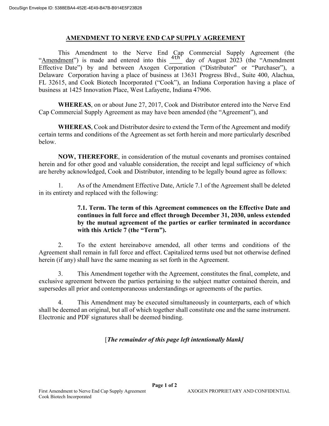 Page 1 of 2 First Amendment to Nerve End Cap Supply Agreement AXOGEN PROPRIETARY AND CONFIDENTIAL Cook Biotech Incorporated AMENDMENT TO NERVE END CAP SUPPLY AGREEMENT This Amendment to the Nerve End Cap Commercial Supply Agreement (the “Amendment”) is made and entered into this ____ day of August 2023 (the “Amendment Effective Date”) by and between Axogen Corporation (“Distributor” or “Purchaser”), a Delaware Corporation having a place of business at 13631 Progress Blvd., Suite 400, Alachua, FL 32615, and Cook Biotech Incorporated (“Cook”), an Indiana Corporation having a place of business at 1425 Innovation Place, West Lafayette, Indiana 47906. WHEREAS, on or about June 27, 2017, Cook and Distributor entered into the Nerve End Cap Commercial Supply Agreement as may have been amended (the “Agreement”), and WHEREAS, Cook and Distributor desire to extend the Term of the Agreement and modify certain terms and conditions of the Agreement as set forth herein and more particularly described below. NOW, THEREFORE, in consideration of the mutual covenants and promises contained herein and for other good and valuable consideration, the receipt and legal sufficiency of which are hereby acknowledged, Cook and Distributor, intending to be legally bound agree as follows: 1. As of the Amendment Effective Date, Article 7.1 of the Agreement shall be deleted in its entirety and replaced with the following: 7.1. Term. The term of this Agreement commences on the Effective Date and continues in full force and effect through December 31, 2030, unless extended by the mutual agreement of the parties or earlier terminated in accordance with this Article 7 (the “Term”). 2. To the extent hereinabove amended, all other terms and conditions of the Agreement shall remain in full force and effect. Capitalized terms used but not otherwise defined herein (if any) shall have the same meaning as set forth in the Agreement. 3. This Amendment together with the Agreement, constitutes the final, complete, and exclusive agreement between the parties pertaining to the subject matter contained therein, and supersedes all prior and contemporaneous understandings or agreements of the parties. 4. This Amendment may be executed simultaneously in counterparts, each of which shall be deemed an original, but all of which together shall constitute one and the same instrument. Electronic and PDF signatures shall be deemed binding. [The remainder of this page left intentionally blank] DocuSign Envelope ID: 5388EBA4-452E-4E49-B47B-B914E5F23B28 4th